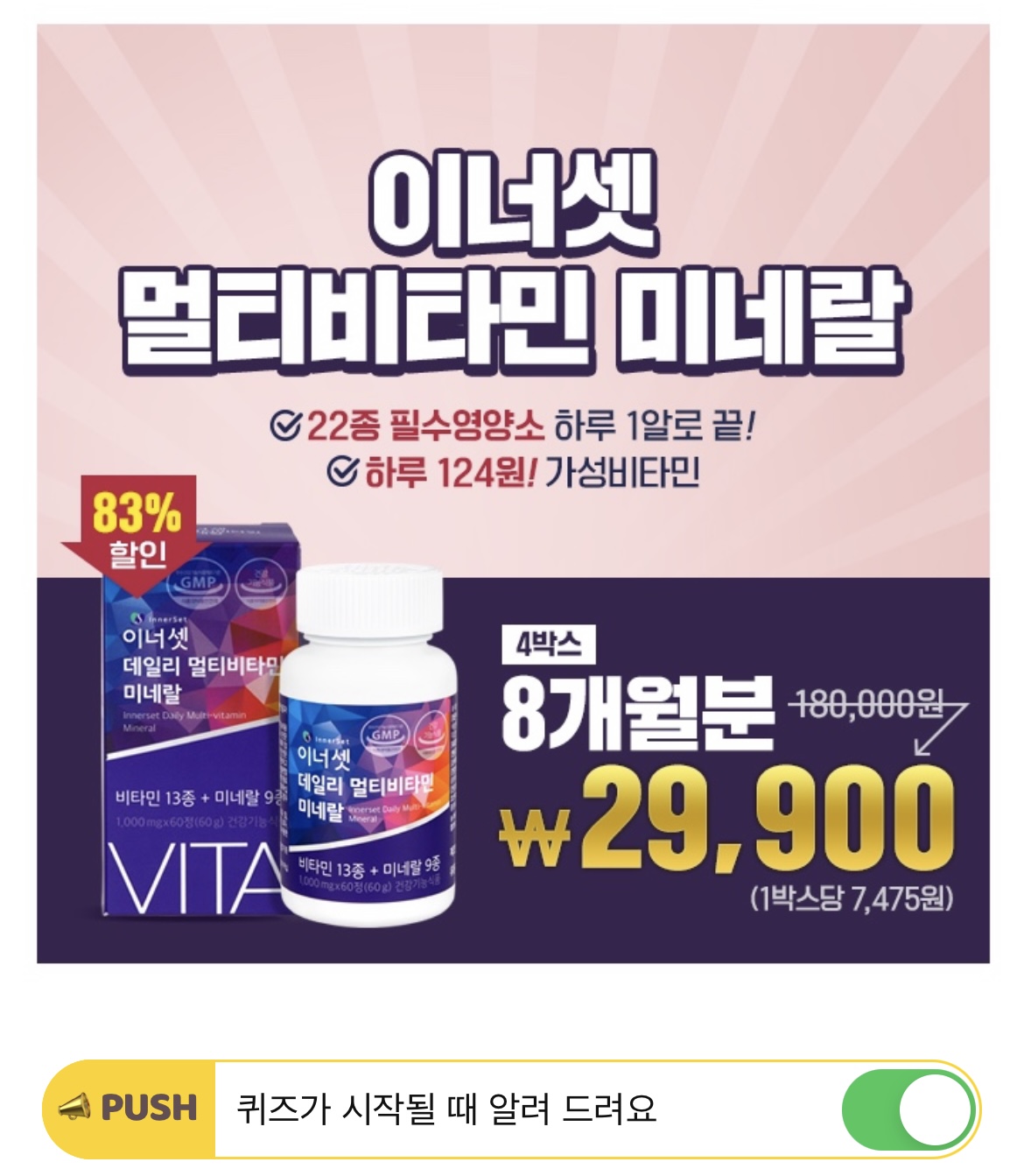 이너셋 멀티비타민 미네랄은 하루 한번, 하루 한알이면 성인이 필요한 OO 비타민과 9종 미네랄을 충분히 섭취할 수 있습니다. 여기서 OO은 무엇일까요? (초성힌트 : ㅁㄷ)