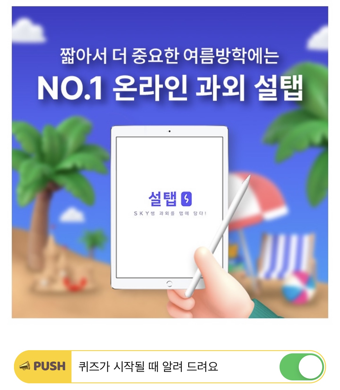 선택과 집중이 가능한 설탭 OOOO은 SKY 선생님들의 꿀팁이 담긴 국영수 특강이 무료로 제공됩니다. OOOO에 들어갈 말은 무엇일까요? (힌트 : ㅆㅇㅌㄱ)