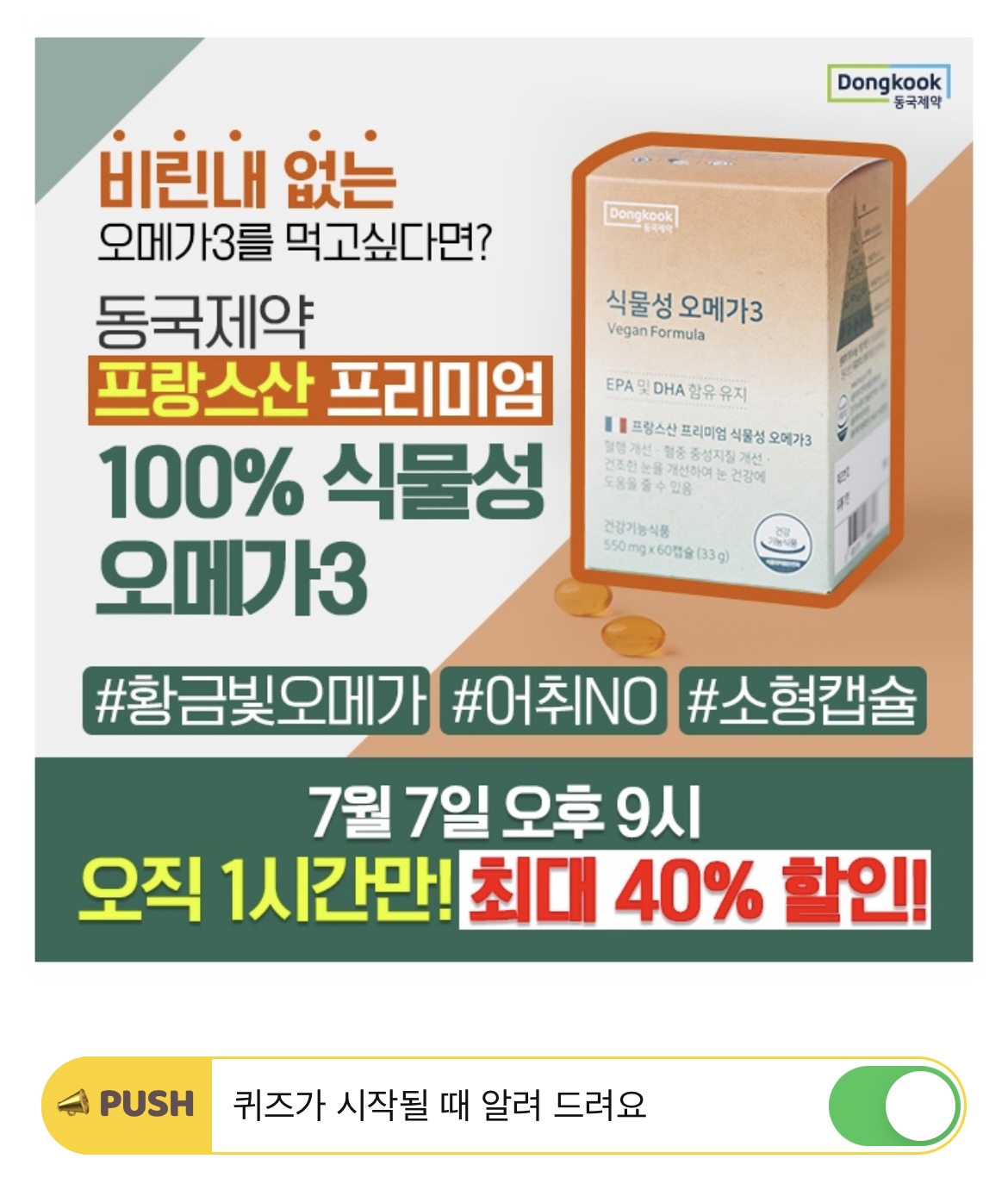 3중 OOO의 프랑스산 프리미엄 오메가3 최대 40%할인 딱 1시간만 초특가 할인되어집니다. OOO에 들어갈 내용은 무엇일까요?