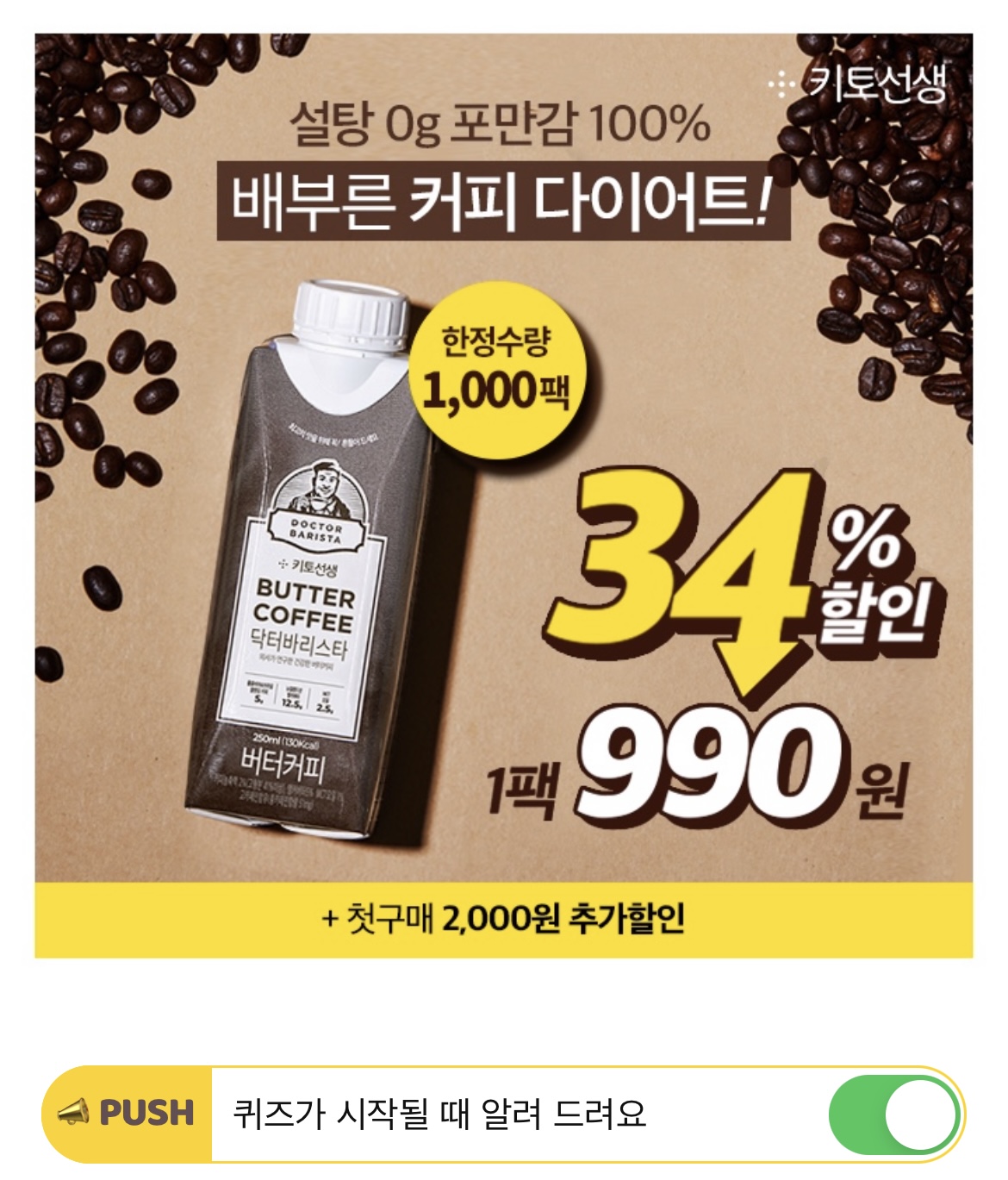 네이버 쇼핑 "방탄커피" 랭킹 1위! 닥터바리스타 버터커피는 지방을 에너지로 빠르게 전환시켜 다이어트에 도움을 주는 MCT오일 C8을 'OO.4'% 사용했습니다. 빈칸에 들어갈 숫자는 무엇일까요?