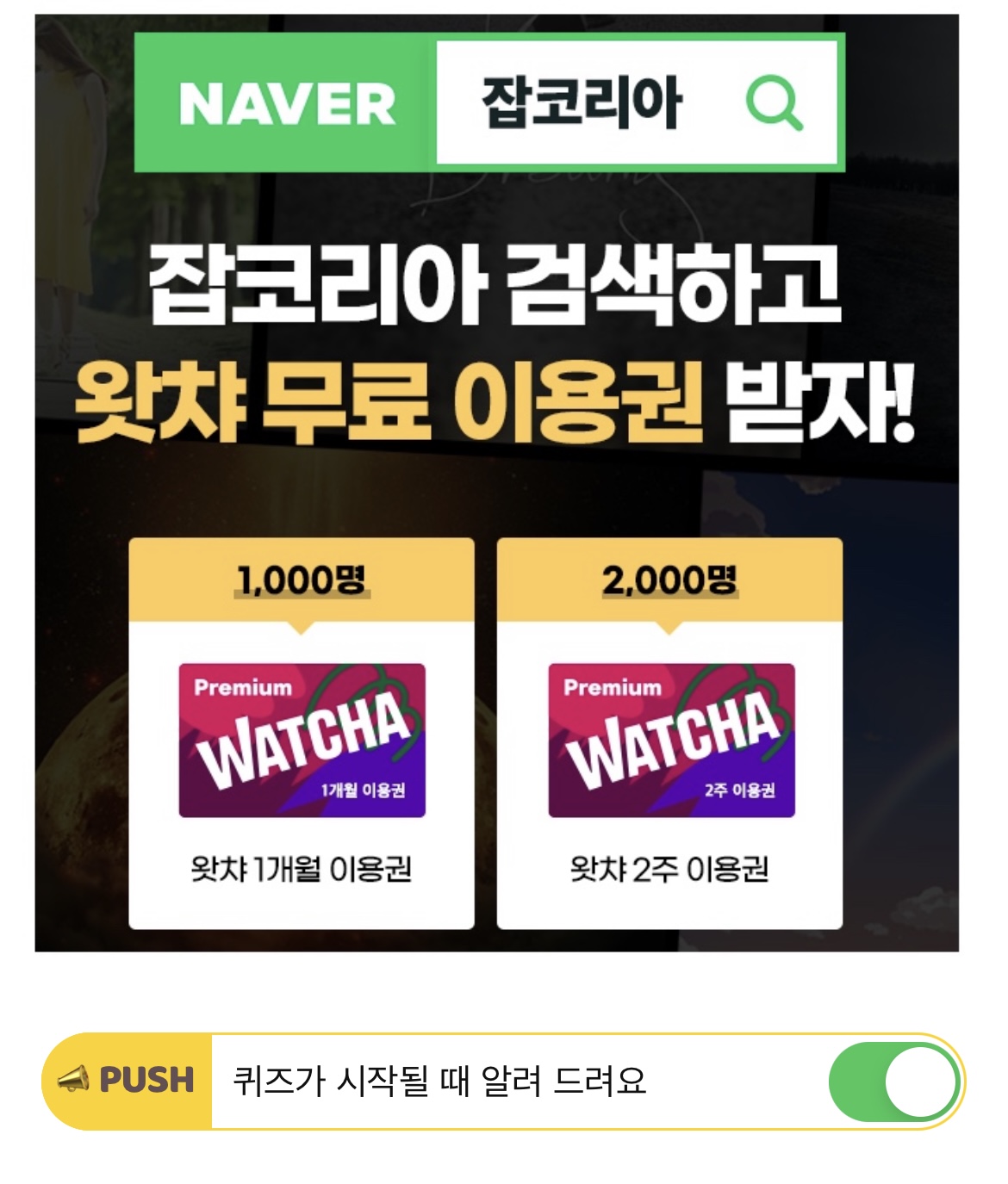 취업플랫폼 잡코리아에서는 영화, 드라마, 애니메이션 등의 영상 콘텐츠 이용권인 '왓챠' 프리미엄 이용권을 제공하는 이벤트 진행중입니다. 이 때, 잡코리아와 왓챠가 콜라보 한 이벤트명은 무엇일까요? (힌트 : 7글자)