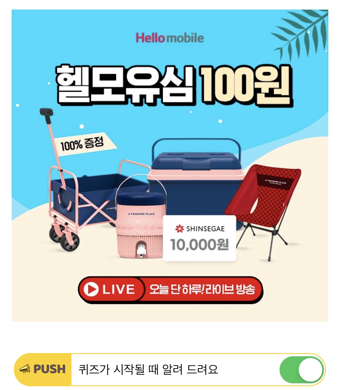 오늘 단 하루 !네이버 쇼핑 라이브 방송 중100원 OO잡고 캠핑가자! 헬로모자일 X 투썸캠핑전! OO에 들어갈 단어는 무엇일까요?