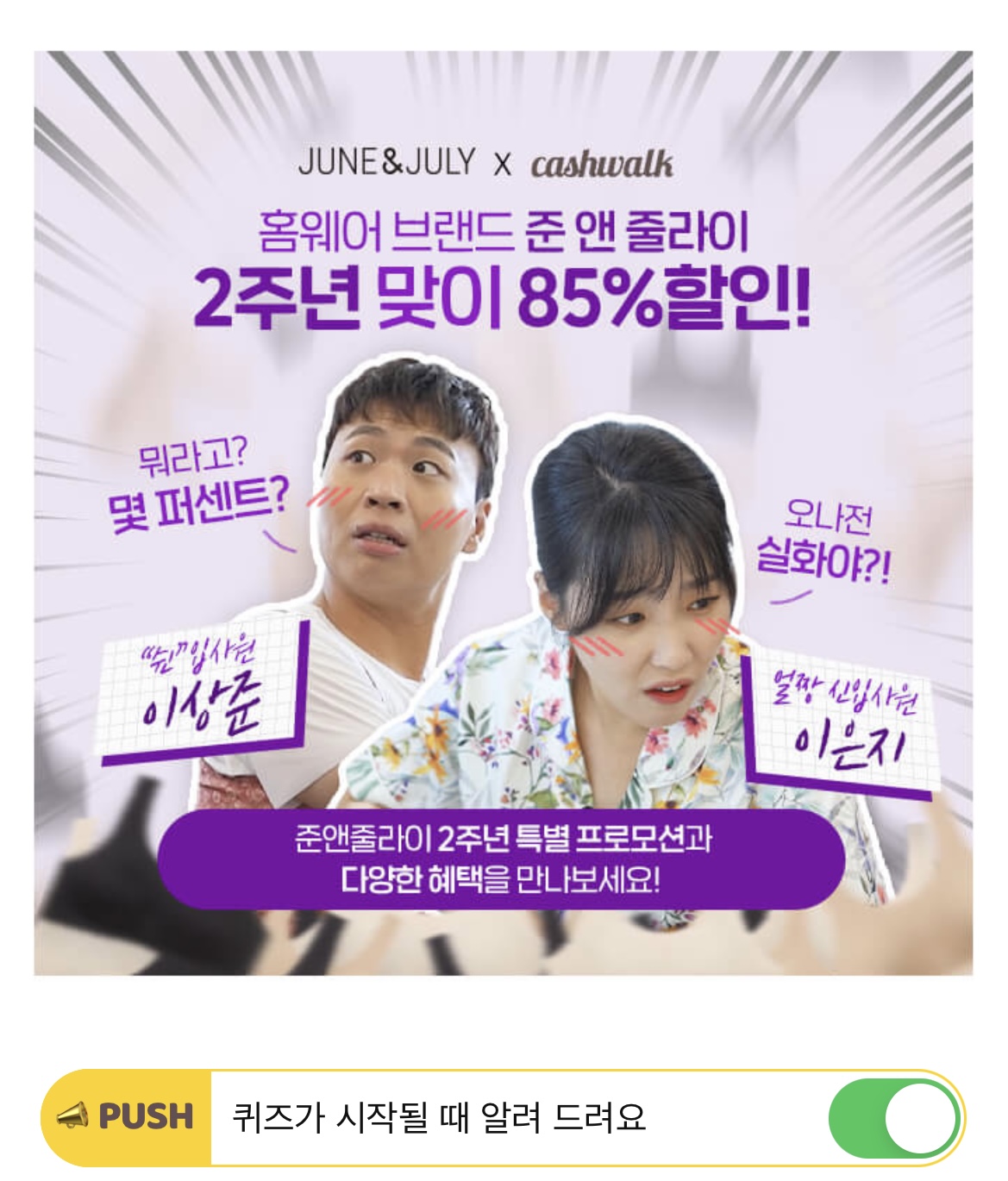 홈웨어 브랜드 준앤줄라이 2주년 프로모션으로 쉰입사원 OOO,이은지의 100% 애드리브 특별 영상! 85% 파격 할인 어서 득템하세요!