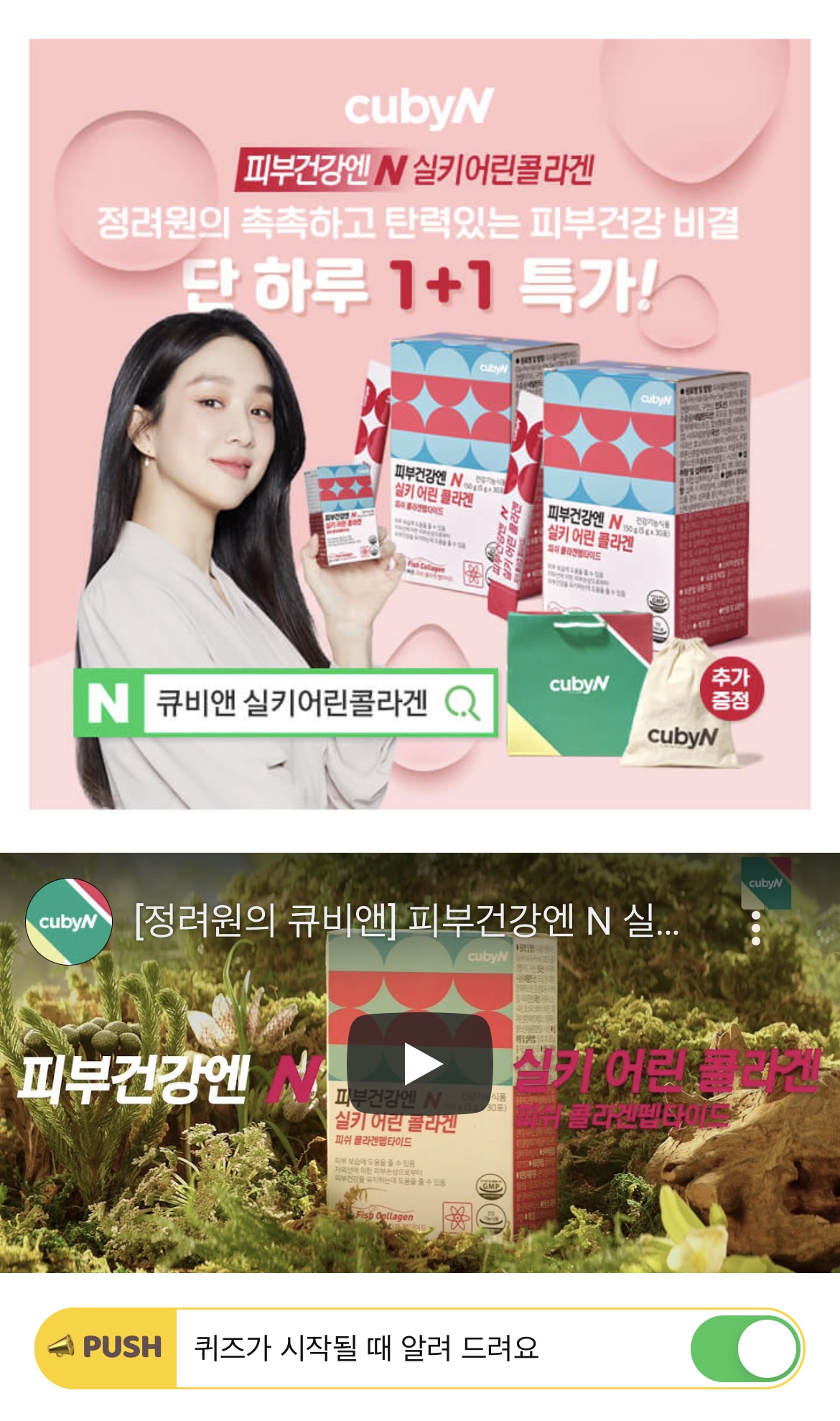 피부보습 및 자외선에 의한 피부건강에 도움을 줄 수 있는 2중 기능성 콜라겐을 함유하고 있는 ★큐비앤 피부건강엔N OOOOOOO!★ 빈칸에 들어갈 단어는 무엇일까요?