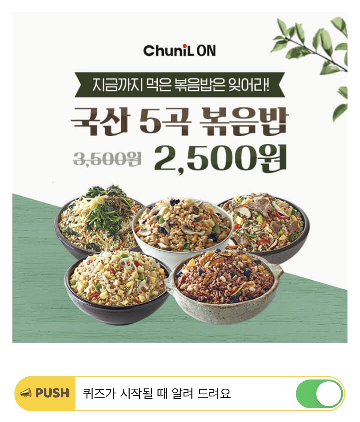 천일 건강볶음밥은 5가지 제품으로 구성되어있습니다. 나물밥, 버섯밥, 뿌리채소밥, 소불고기밥, OOOO밥 OOOO에 들어갈 단어는 무엇일까요? (초성 힌트: ㅇㅇㅊㅇ)