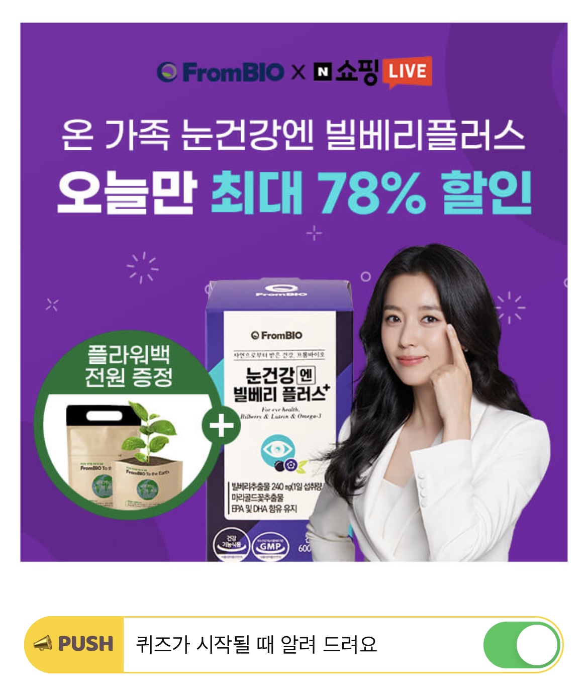 최근 프롬바이오에서 일명 [OOO OOO]으로 불리는, 눈건강엔 빌베리플러스 제품을 새롭게 선보이고 있는데요. 눈 건강을 위한 루테인, 빌베리, 오메가3가 함유된 3중 복합 기능성 제품으로 인기를 받고 있습니다. OOOOOO 은 무엇일까요? (힌트 : ㅎㅎㅈㄴㄱㄱ)