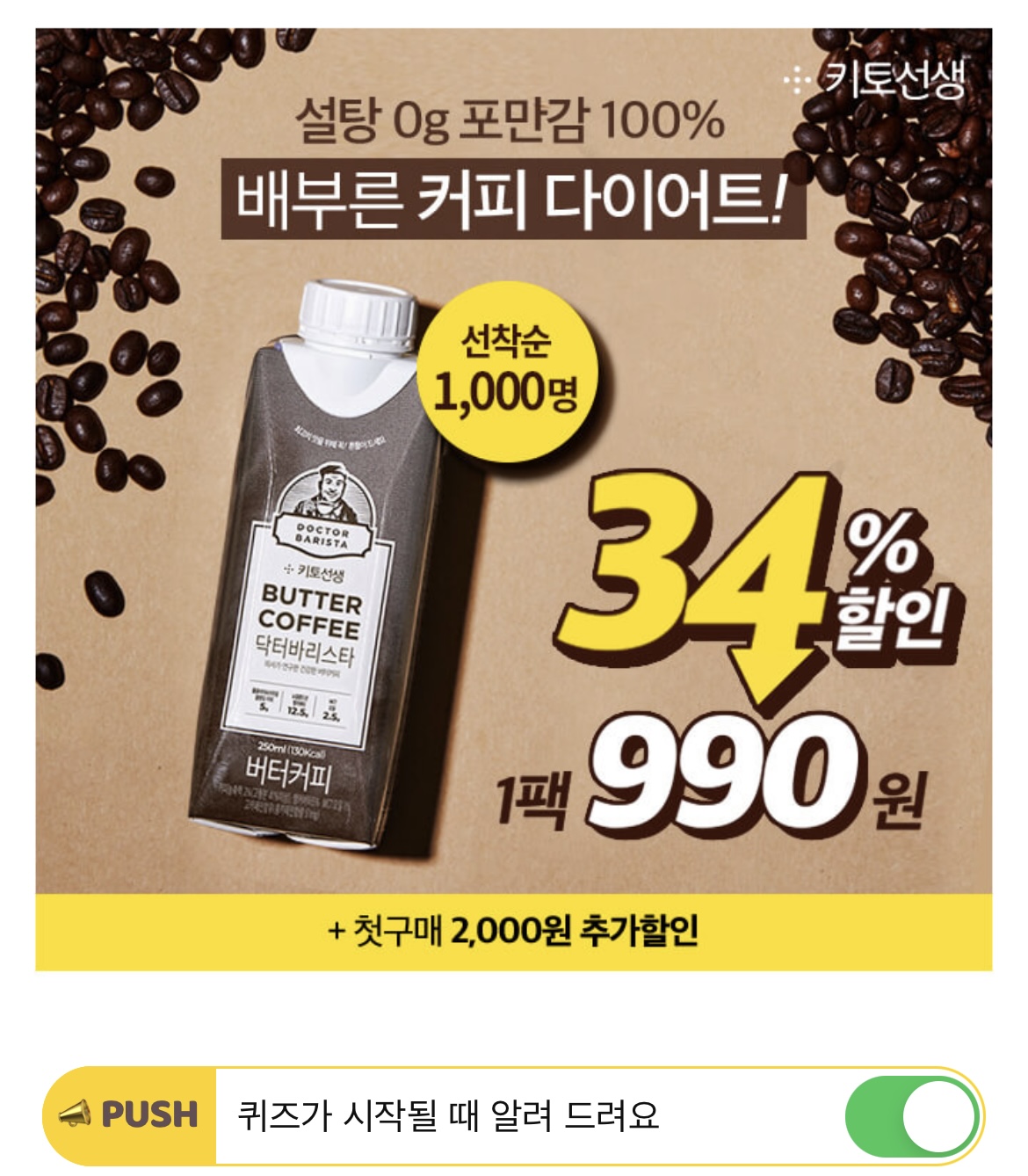 1주일만에 2kg감량! 닥터바리스타 방탄커피는 탄수화물을 줄이고 건강한 지방으로 채웠을 뿐 아니라 설탕 'O'g으로 저탄고지 다이어트에 큰 도움이 됩니다. 빈칸에 들어갈 숫자는 무엇일까요?