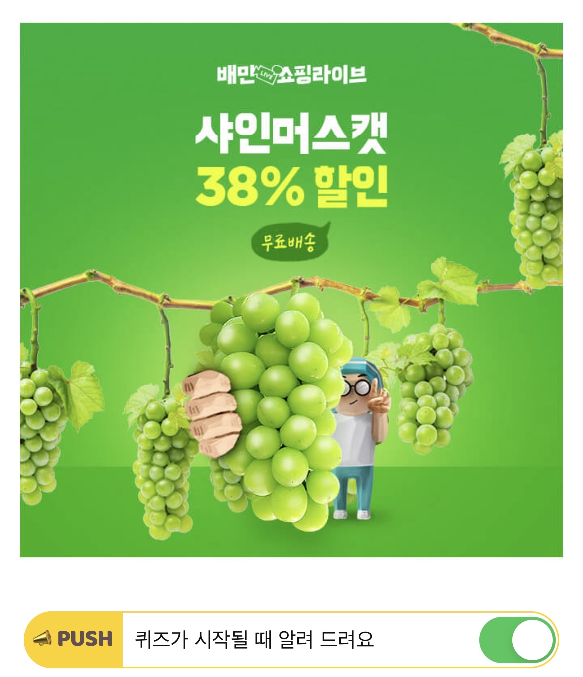 오늘 배민쇼핑라이브에서는 샤인머스캣을 최대 38% 할인한 OO,OOO원에 판매합니다! OOOOO원은 얼마일까요?