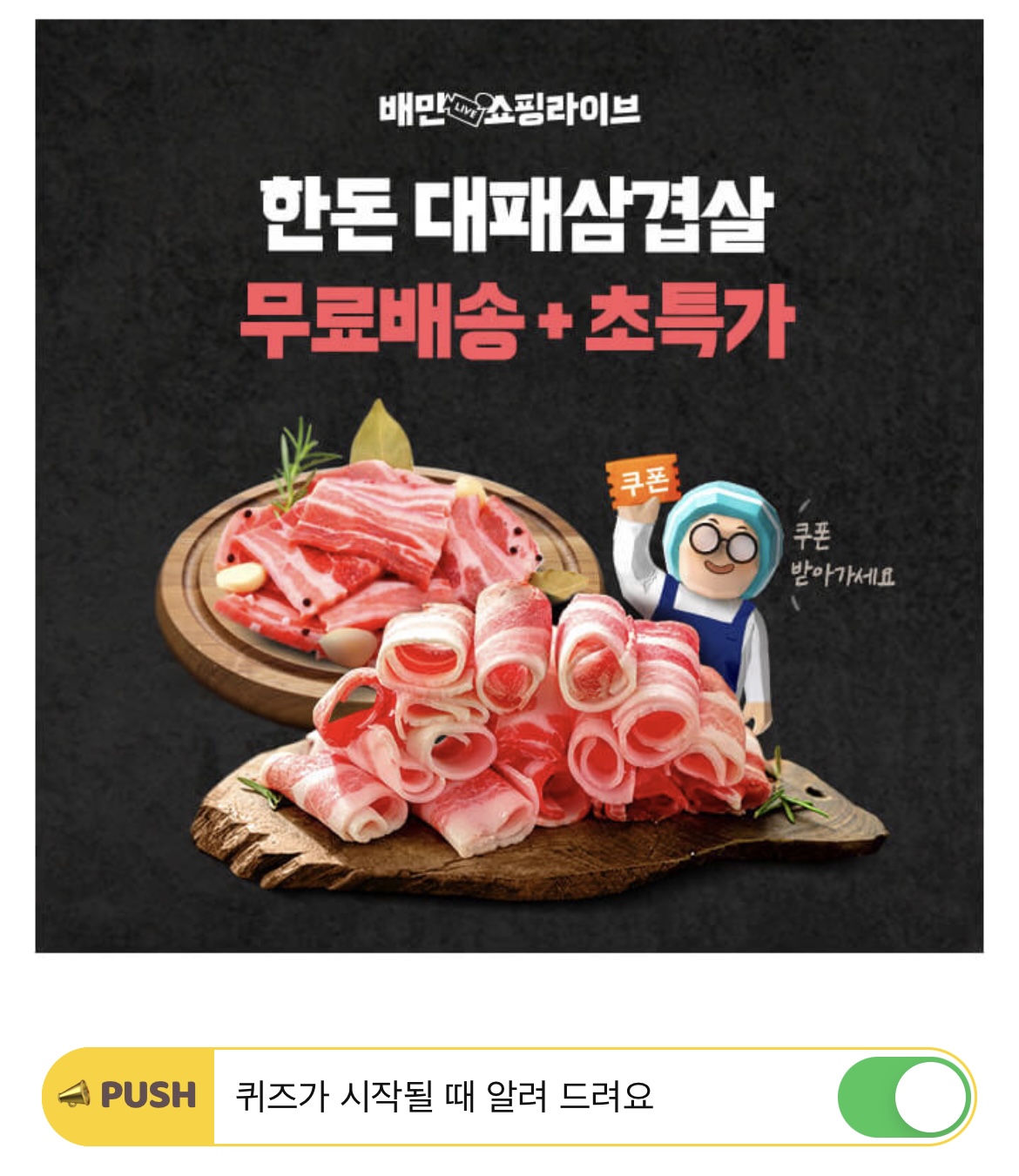 오늘 배민쇼핑라이브에서는 추억의 한돈 대패삼겹살 4인분을 OOO대 에 판매합니다! OOO에 들어갈 말은 무엇일까요?
