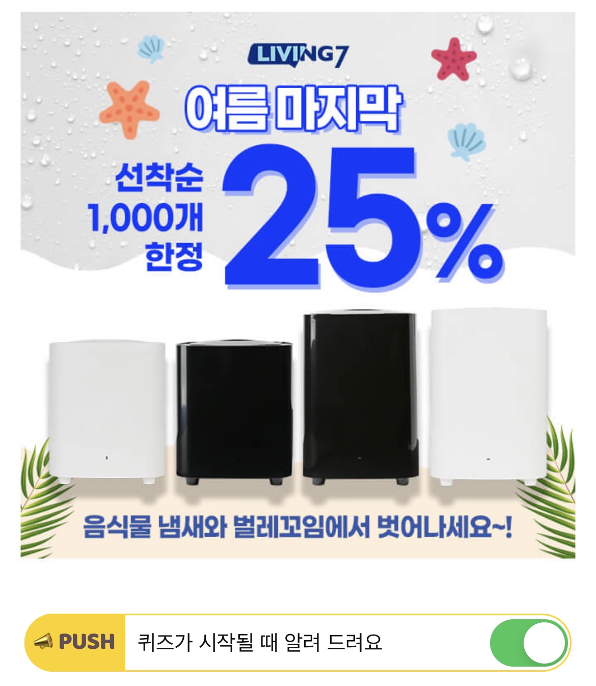 리빙7 음쓰쿨장고는 세척의 번거로룸을 줄이기 위해 내통을 일체화했습니다. OO만 설치해 편리하게 사용하세요. OO에 들어갈 단어는 무엇일까요? (힌트 : ㅂㅈ)