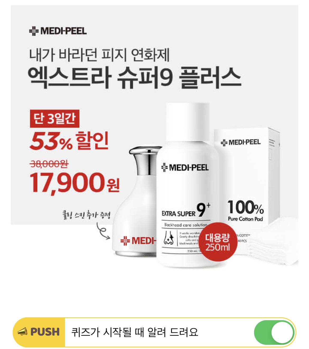 현재 엑스트라 슈퍼9 플러스 53% 할인과 더불어 추가 증정되는 제품으로 유효 성분의 흡수를 높이고 모공 진정 쿨마사지에 도움을 주는 OOO 쿨링 스킨은 메디필의 피지연화제 '엑스트라 슈퍼9 플러스와 함께 사용하면 좋은 제품으로 알려져 있습니다. OOO 에 들어갈 단어는 무엇일까요? (초성힌트 : ㅍㅍㅌ)