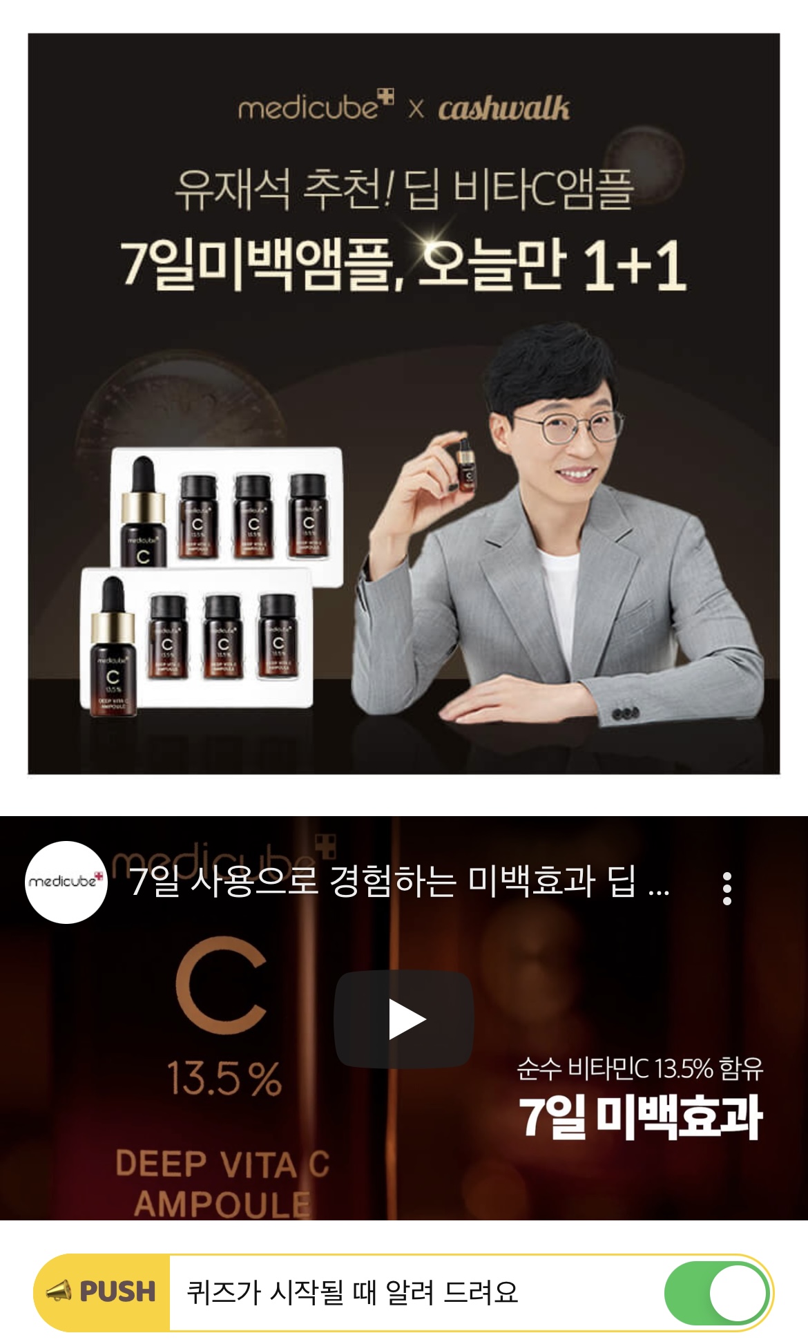 메디큐브 모델 유재석도 추천한, 메디큐브 7일미백앰플 딥비타C앰플은 7일만 사용해도 기미잡티가 개선되는 효과를 보이는데요, 12가지 OOOOOO으로 검증된 미백앰플입니다. OOOOOO에 들어갈 단어는 무엇일까요? (초성힌트 : ㅇㅊㅈㅇㅅㅎ)