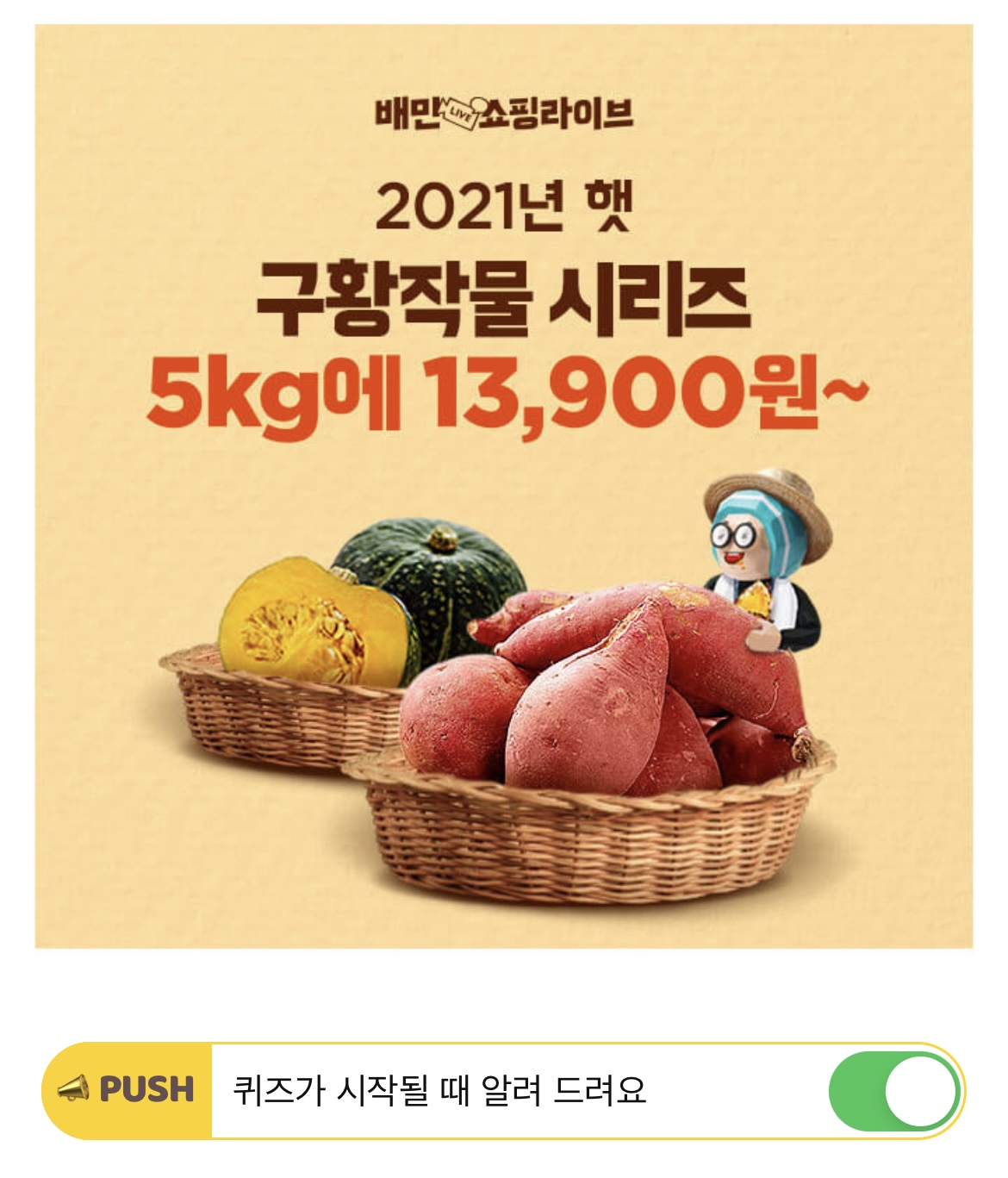 2021년 제철에 첫 수확한 햇 구황작물 시리즈가 배민쇼핑라이브에 찾아왔어요! 총 0종의 햇 구황작물을 초특가+무료배송으로 판매하는데요, 총 0종의 구황작물을 판매할까요?