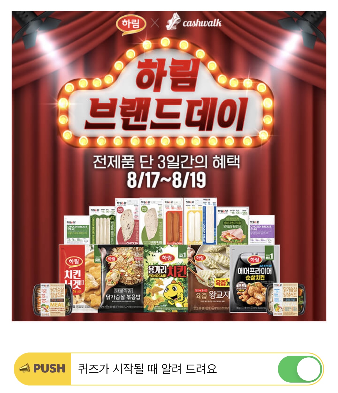 하림 브랜드데이는 단, ○○○만 전제품 할인, 적립, 증정 혜택을 한 번에 받을 수 있는 이벤트입니다. ○○○○은 무엇일까요? (Hint. 숫자+한글)