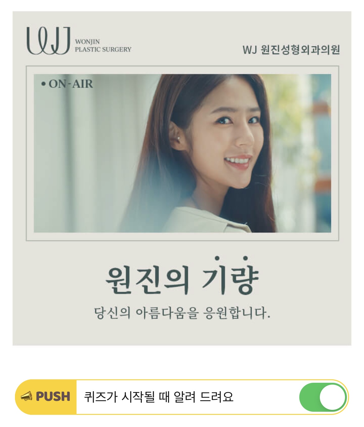 박기량의 자연스럽고 밝은 에너지 그리고 WJ원진성형외과가 추구하는 가치가 함께 담겨 있는 영상의 마지막 카피는 OOO OOO입니다.