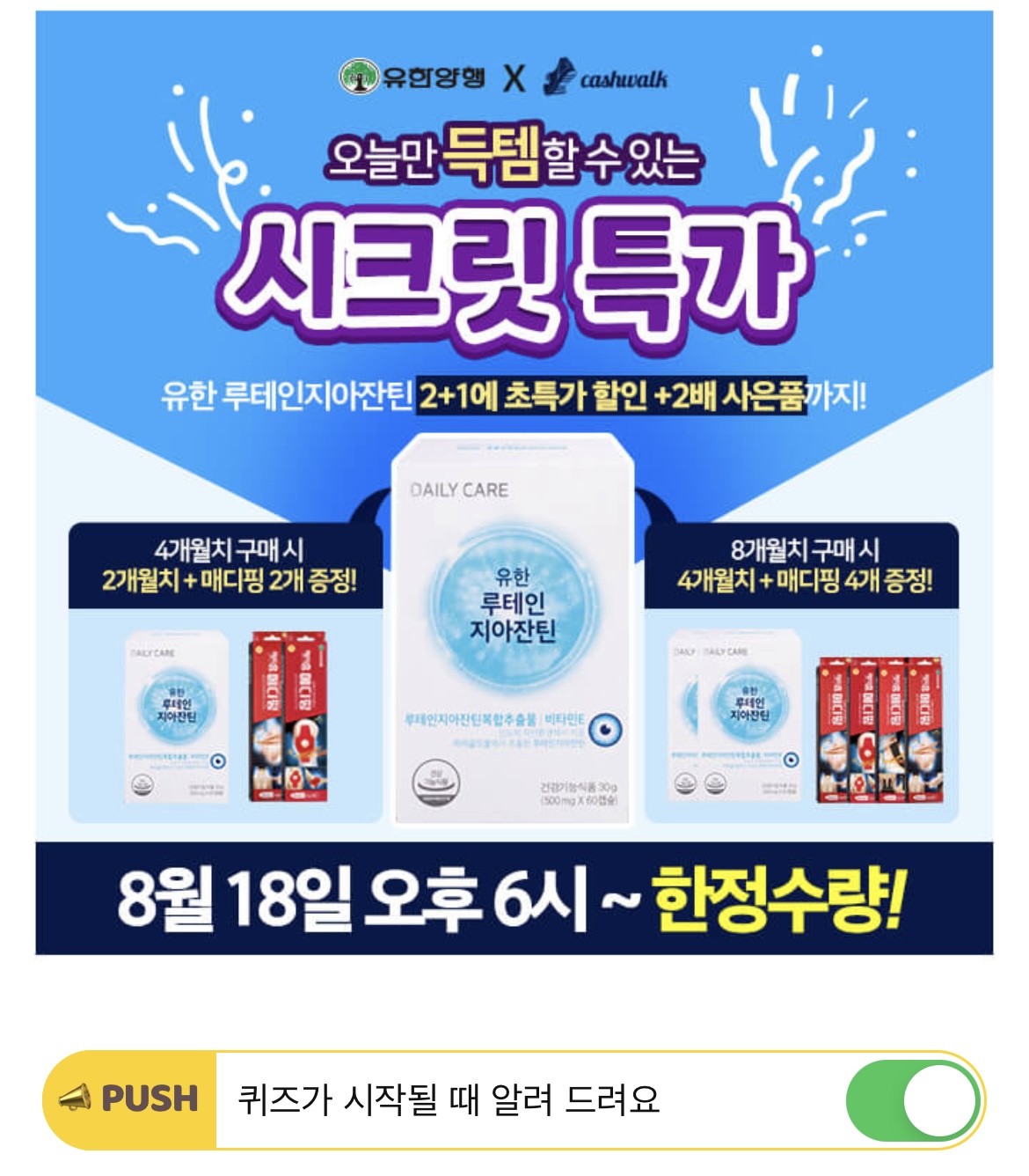 | 동국제약 식물성오메가3 캐시워크/캐시닥 돈버는퀴즈 정답 8월18일 5시 (0) | 2021.08.18 |