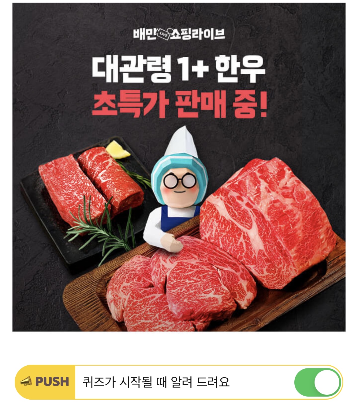 오늘 배민쇼핑라이브에서는 대관령에서 건강하게 자란 1+ 한우를 O,OOO원에 판매합니다! OOOO은 얼마일까요~?