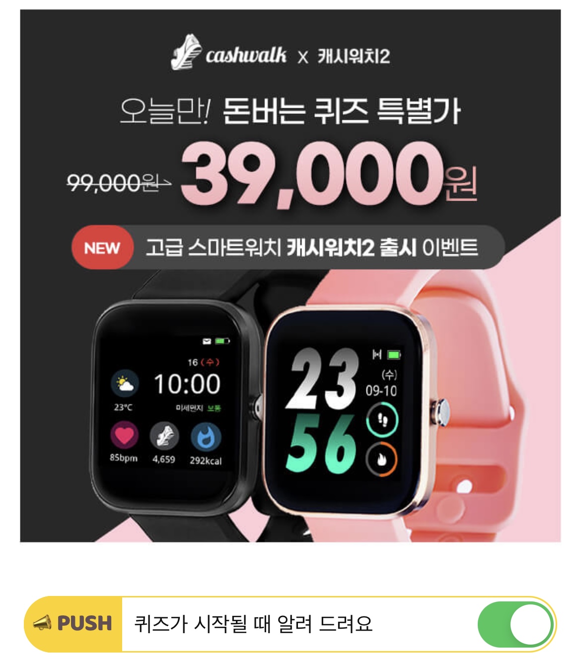 캐시워치2는 운동 모니터링, 수면 모니터링, 각종 앱 알림등 타사 고가 워치와 맞먹는 기능을 돈버는 퀴즈 론칭 특가로 무려 'OOOOO'원에 제공합니다. OOOOO에 들어갈 단어는 무엇일까요?