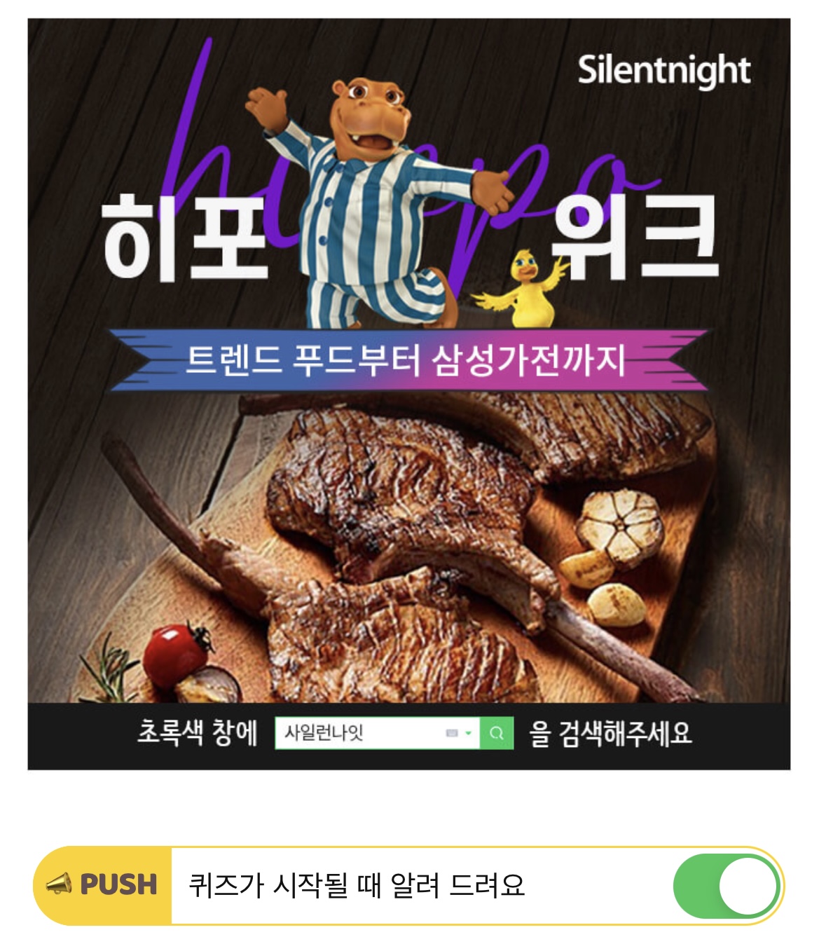 8월 사일런나잇 히포위크에서는 캠핑 및 집에서 온가족이 함께 즐길 수 있는 홈레스토랑 제품, 최고 품질의 한돈+송로버섯 오일과 히말라야 핑크솔트로 OOOOO한 한돈 토마호크 3P를 N사 최저가 보다 저렴하게 구매가 가능하다. OOOOO에 들어갈 단어는 무엇일까요? (힌트: ㅁㄹㄴㅇㄷ)