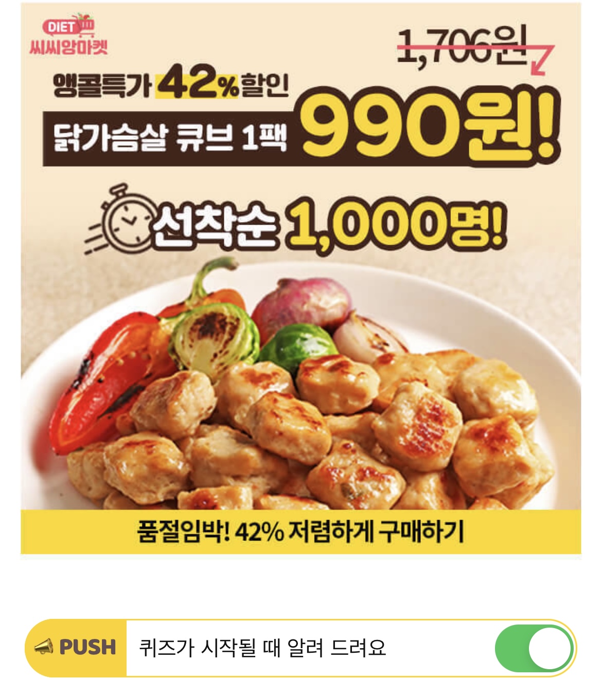 45만 다이어터의 노하우가 담긴 '씨씨닭'은 신선한 닭고기를 도계 즉시 영하 35℃에서 급속 냉결하는 IFF 공법으로 OO의 원형을 유지하여 영양소를 꽉 잡았습니다. 빈칸에 들어갈 단어는 무엇일까요? (힌트: ㅅㅍ)