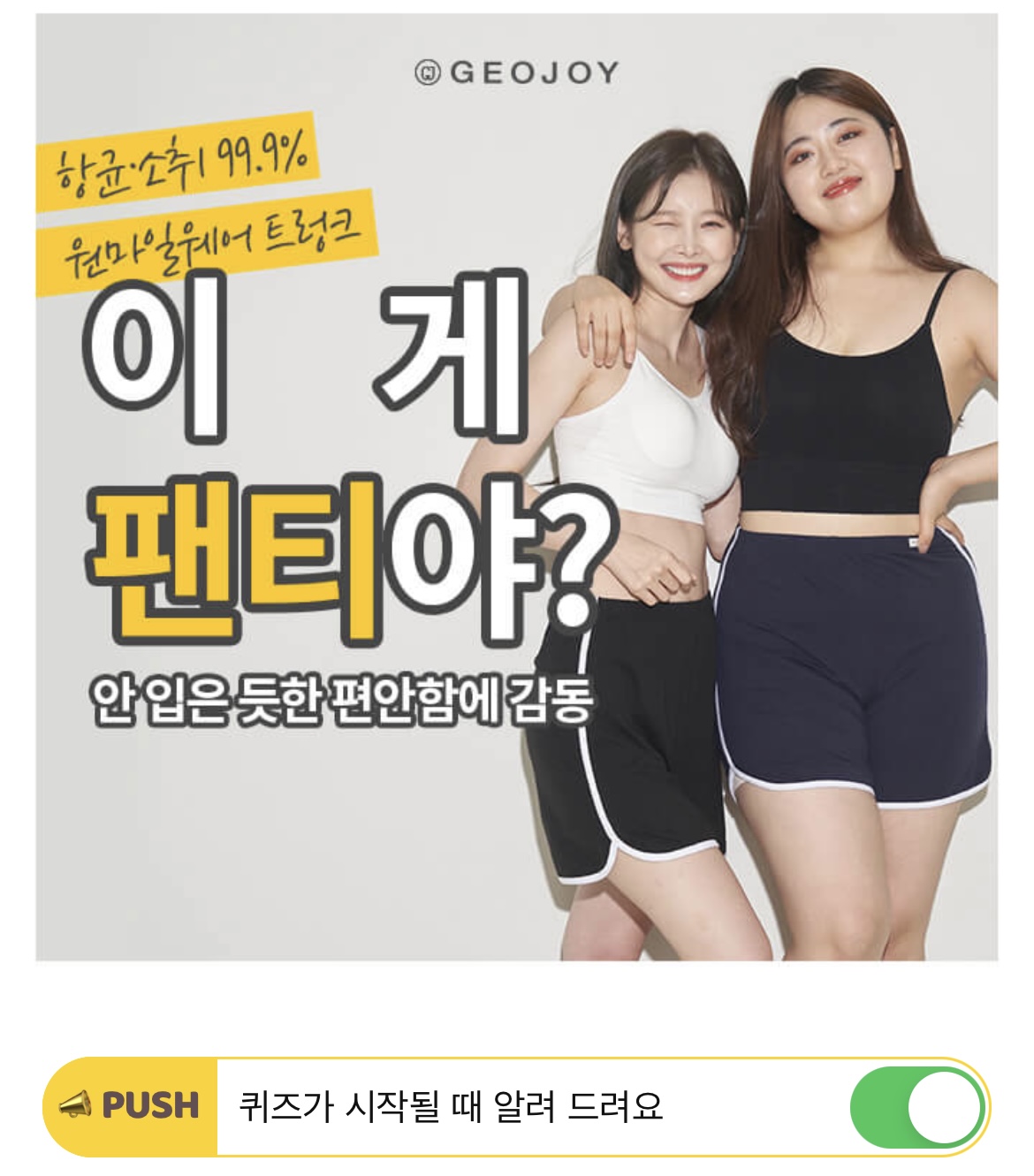 시그니처 매일매일 트렁크는 집에서는 홈웨어로, 밖에서는 OOOOO로 입을 수 있는 올인원 디자인입니다. 가족과 함께 있는 집뿐만 아니라 장을 보러 갈 때, 쓰레기를 버리러 갈 때, 동네에 친구를 만나러 갈 때도 착용할 수 있습니다. 어디서든 코디 가능한 OOOOO디자인으로 노팬티의 자유로움을 느껴보세요. 빈칸에 들어갈 단어는 무엇일까요? (힌트:ㅇㅁㅇㅇㅇ)