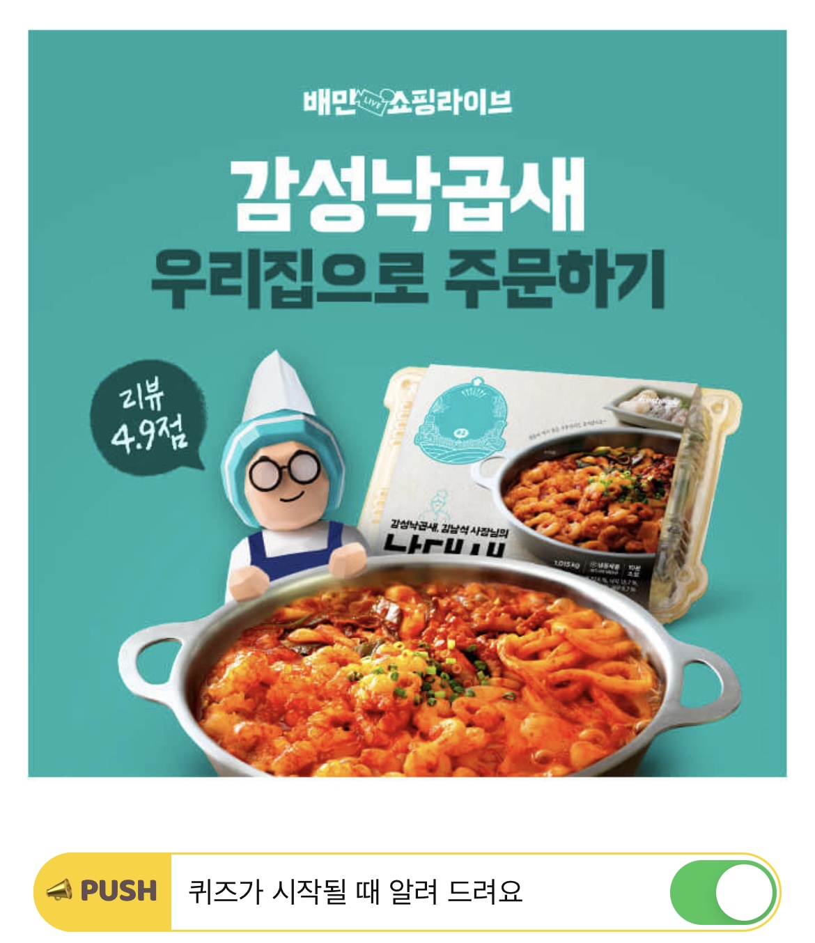 지금! 배민 인기 맛집의 레시피로 만든 밀키트 OOOOO의 두번째 메뉴가 공개됩니다. '감성낙곱새'의 레시피로 만든, 곱창 대신 대창을 넣은 '낙대새'가 공개될 예정인데요. 배민의 숨은 맛집 밀키트 프로젝트 OOOOO의 이름은 무엇일까요?