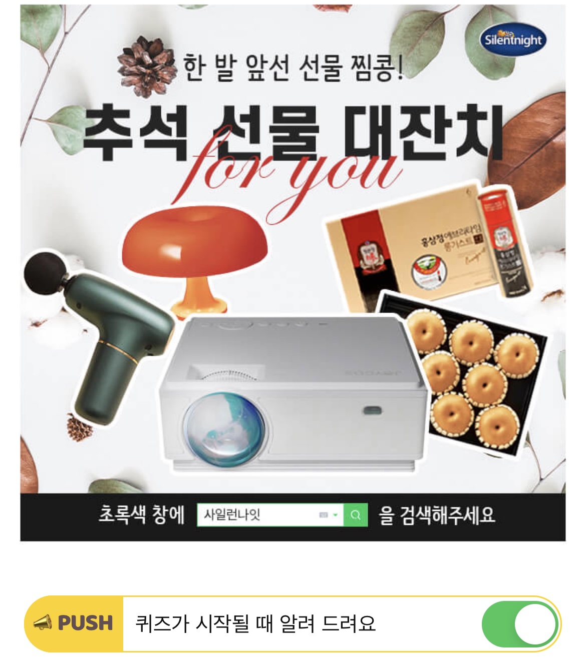 8월 사일런나잇 추석선물 기획전에서 추석연휴 동안 집콕 및 캠핑 등 다양한 장소에서 나만의 영화관을 만드는 감성 끝판왕 OOOO 미니 LCD빔 프로젝터를 N사 최저가 보다 저렴하게 구매가 가능하다. OOOO에 들어갈 단어는 무엇일까요? (힌트: ㅈㅇㅋㅅ)