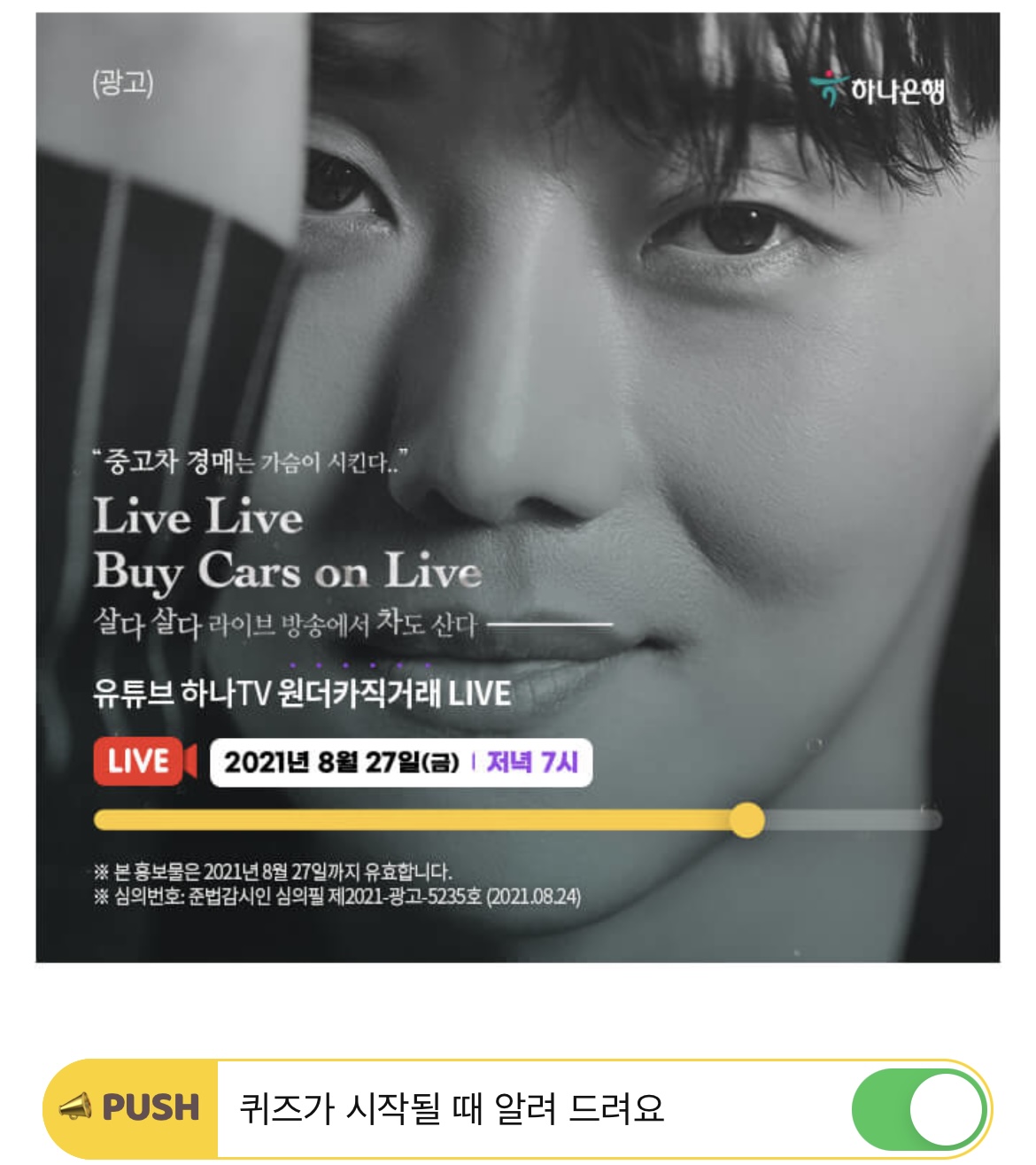 최상급상태의 그랜저와 미니쿠퍼 중고차를 8월27일 저녁 7시 하나은행 유튜브 채널 하나TV에서 보실 수 있습니다. 나도 OOO OO! 여기서  OOOOO에 들어갈 말은 무엇일까요?