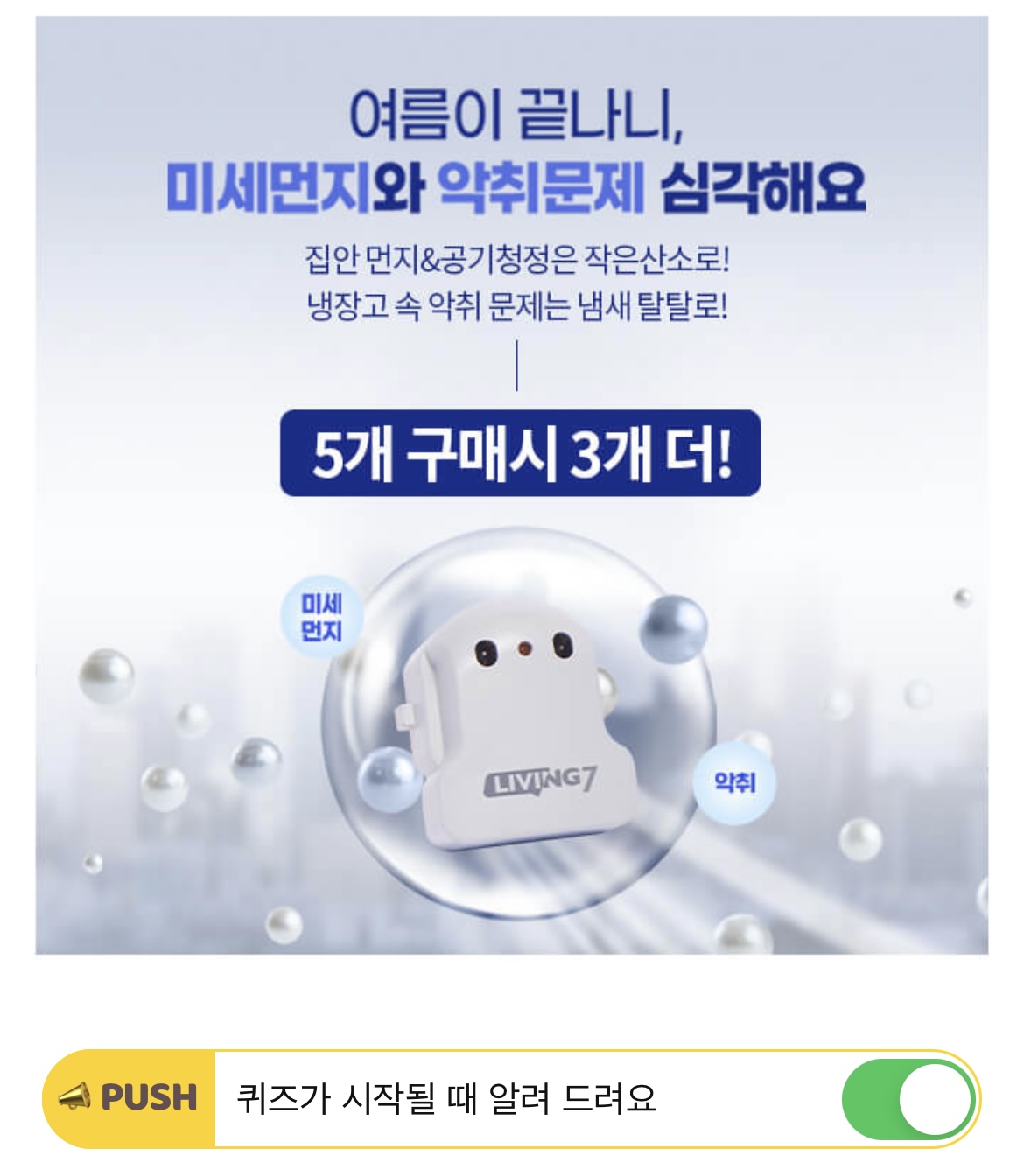리빙7 작은산소는 자연에서 나무가 공기를 정화하는 방식을 사용하여 필터 없이 OO OO를 발생합니다. OOOO에 들어갈 단어는 무엇일까요? (힌트 : ㅁㅇㄱㄱ)
