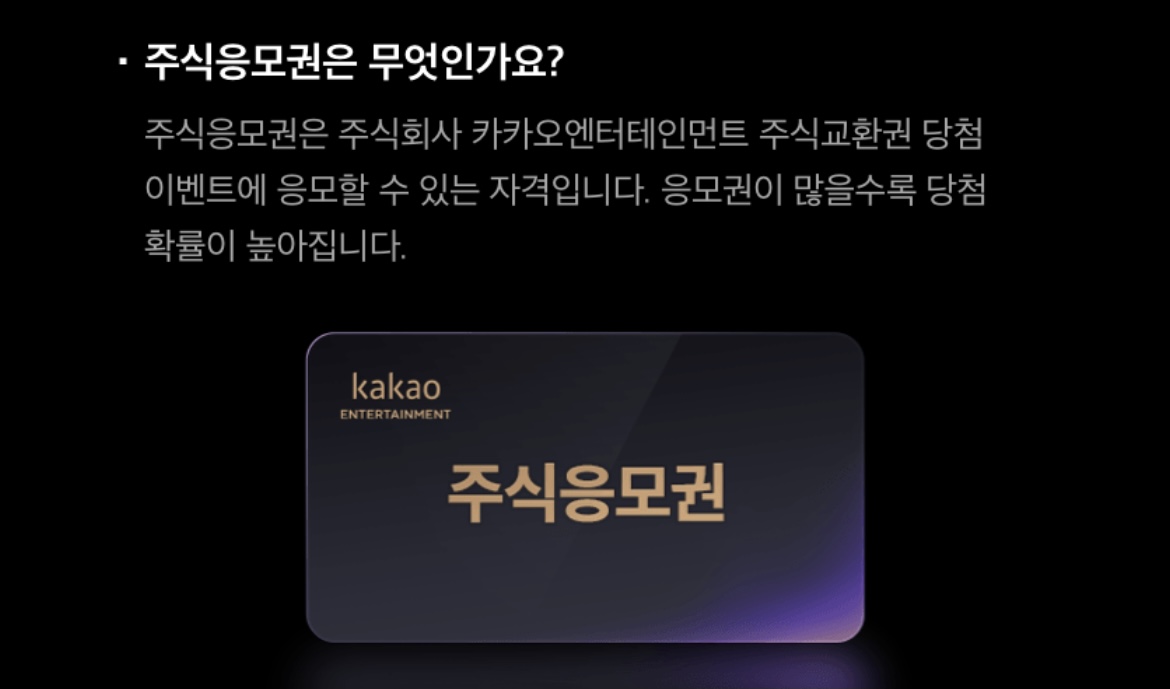 주식응모권은 주식회사 카카오엔터테이먼트 주식교환권 당첨 이벤트에 응모할 수 있는 자격입니다. 응모권이 많을수록 당첨확률이 높아집니다.