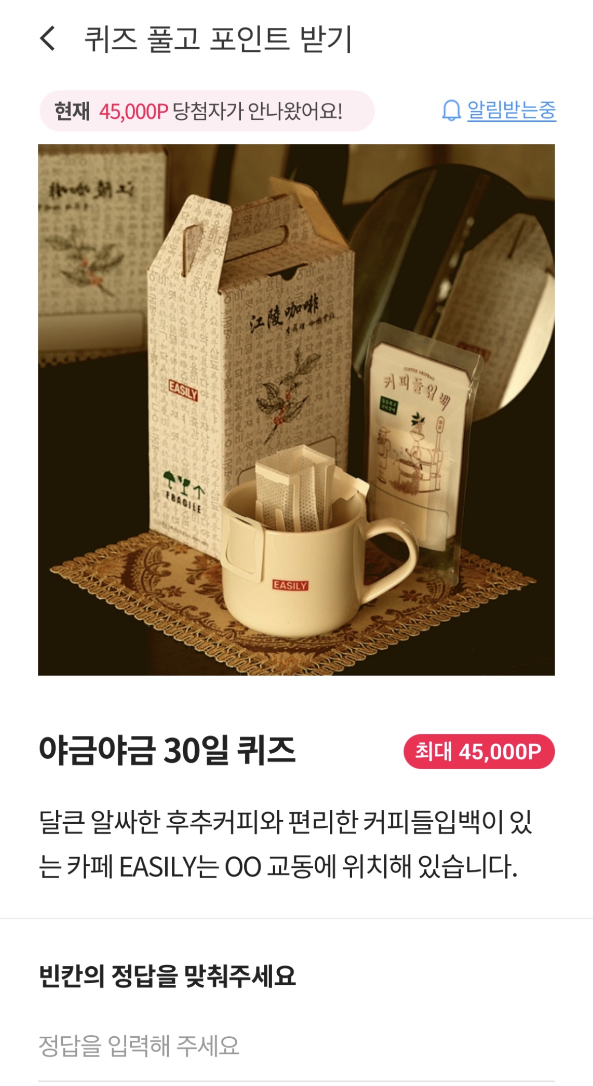 달큰 알싸한 후푸커피와 편리한 커피들팁백이 있는 카페 EASILY는 ㅇㅇ 교동에 위치해 있습니다.