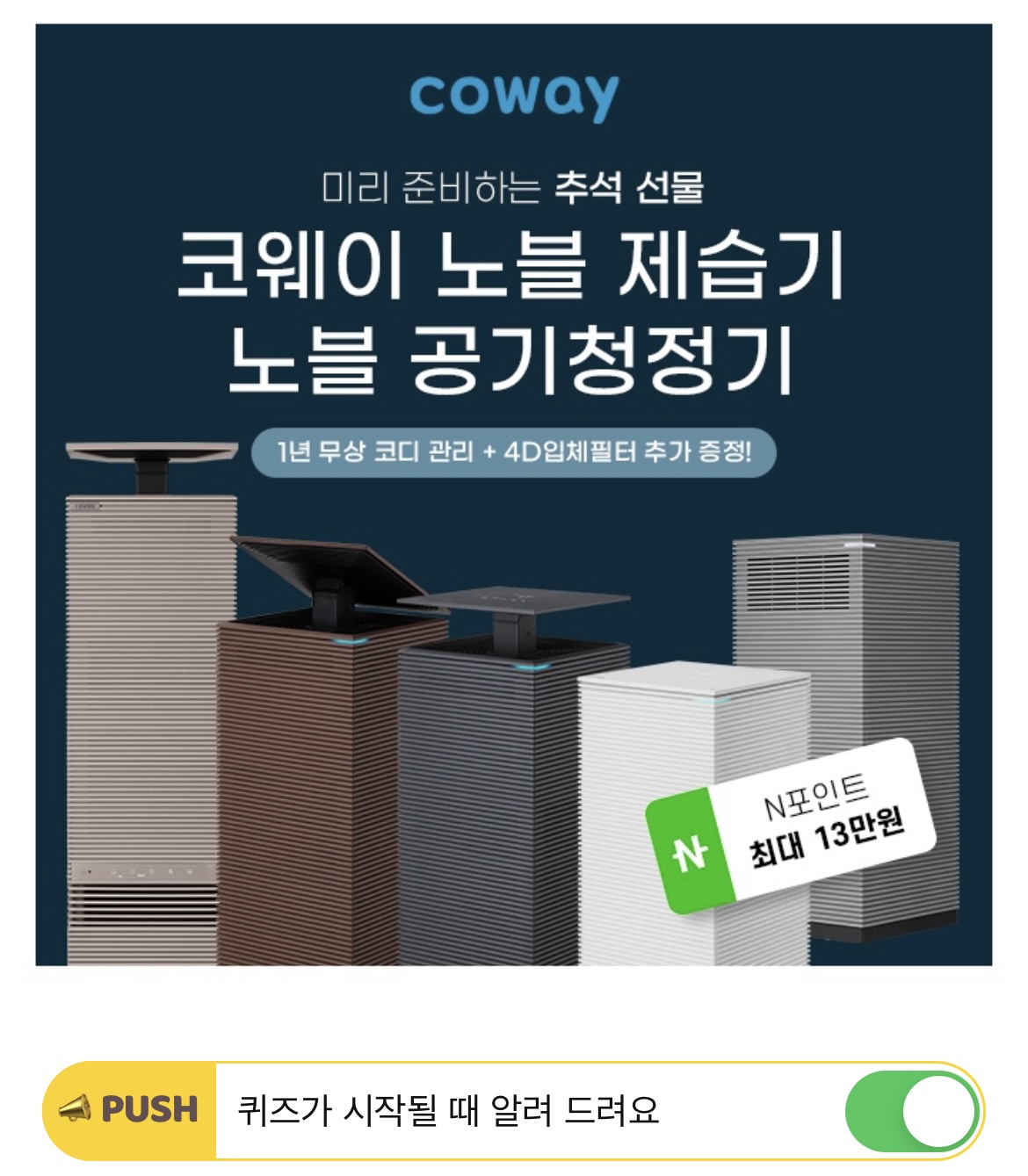 에어클린 항균필터, 더블에어매칭시스템, 그리고 마이펫 모드까지! 코웨이만의 혁신적인 에어 테크놀로지를 담아 더욱 강력한 청정이 가능한 OO공기청정기는 라이브에서만 1년 무상 코디 관리에 4D 입체 필터 증정, N포인트 최대 13만원 추가 적립을 받을 수 있습니다!