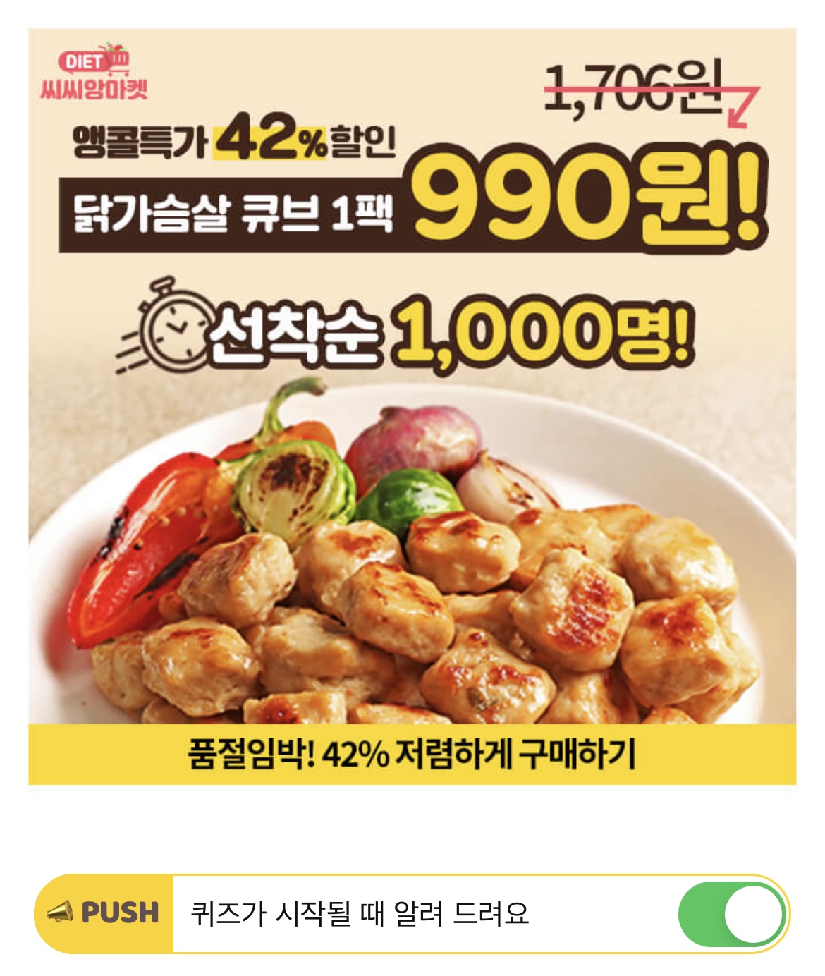 45만 다이어터의 솔직한 의견과 풍부한 노하우로 완성된 씨씨닭 닭가슴살 큐브는 고기에 딱 맛있게 간이 배게하고 부드러운 식감을 높이기 위해서 24시간 OOOO을 했습니다. 빈칸에 들어갈 단어는 무엇일까요? (힌트: ㅈㅇㅅㅅ)