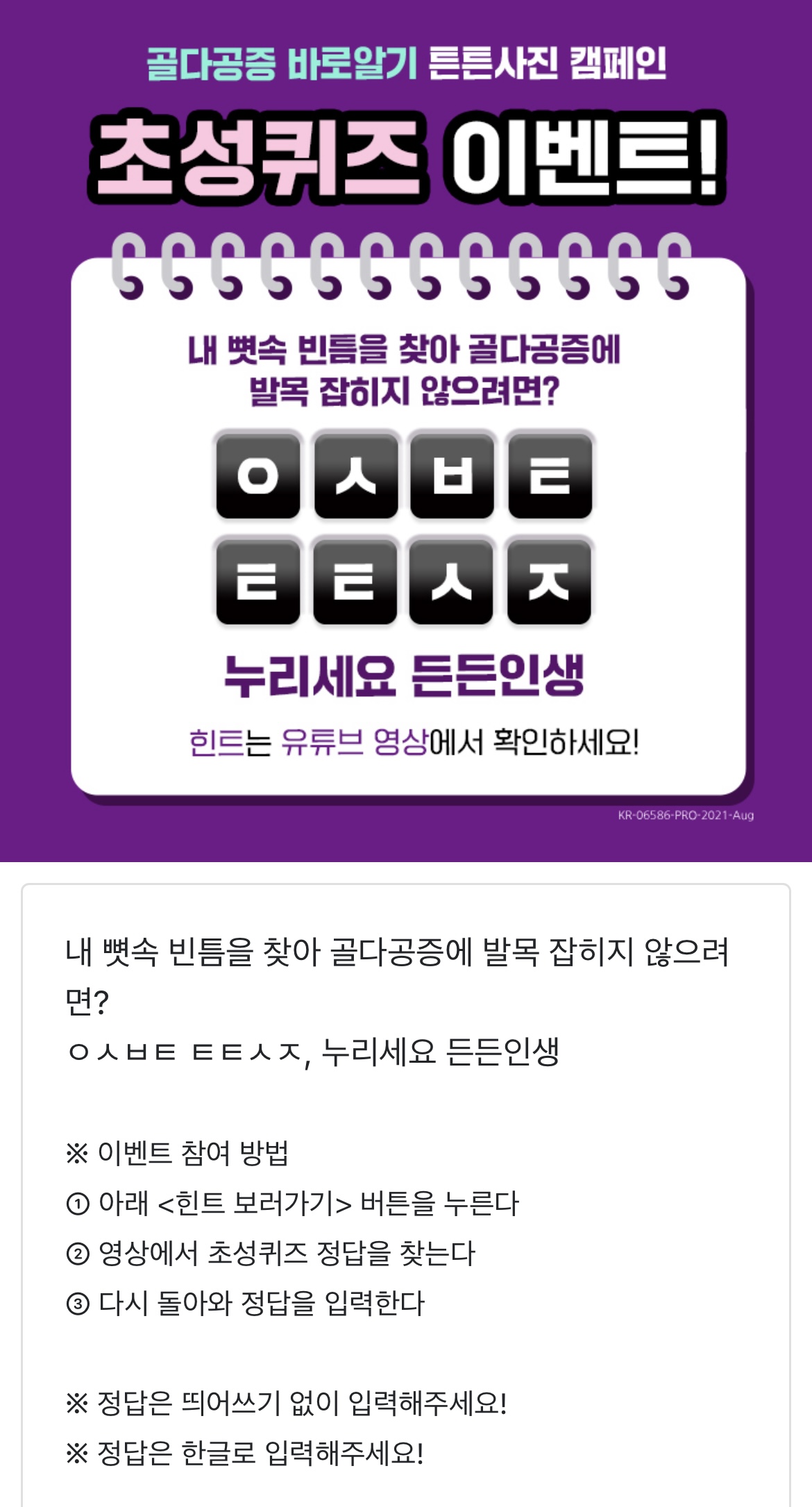 | 튼튼사진 캠페인 ㄱㄱㅎㄱㅈ 캐시슬라이드 초성퀴즈 9월3일 (0) | 2021.09.03 |