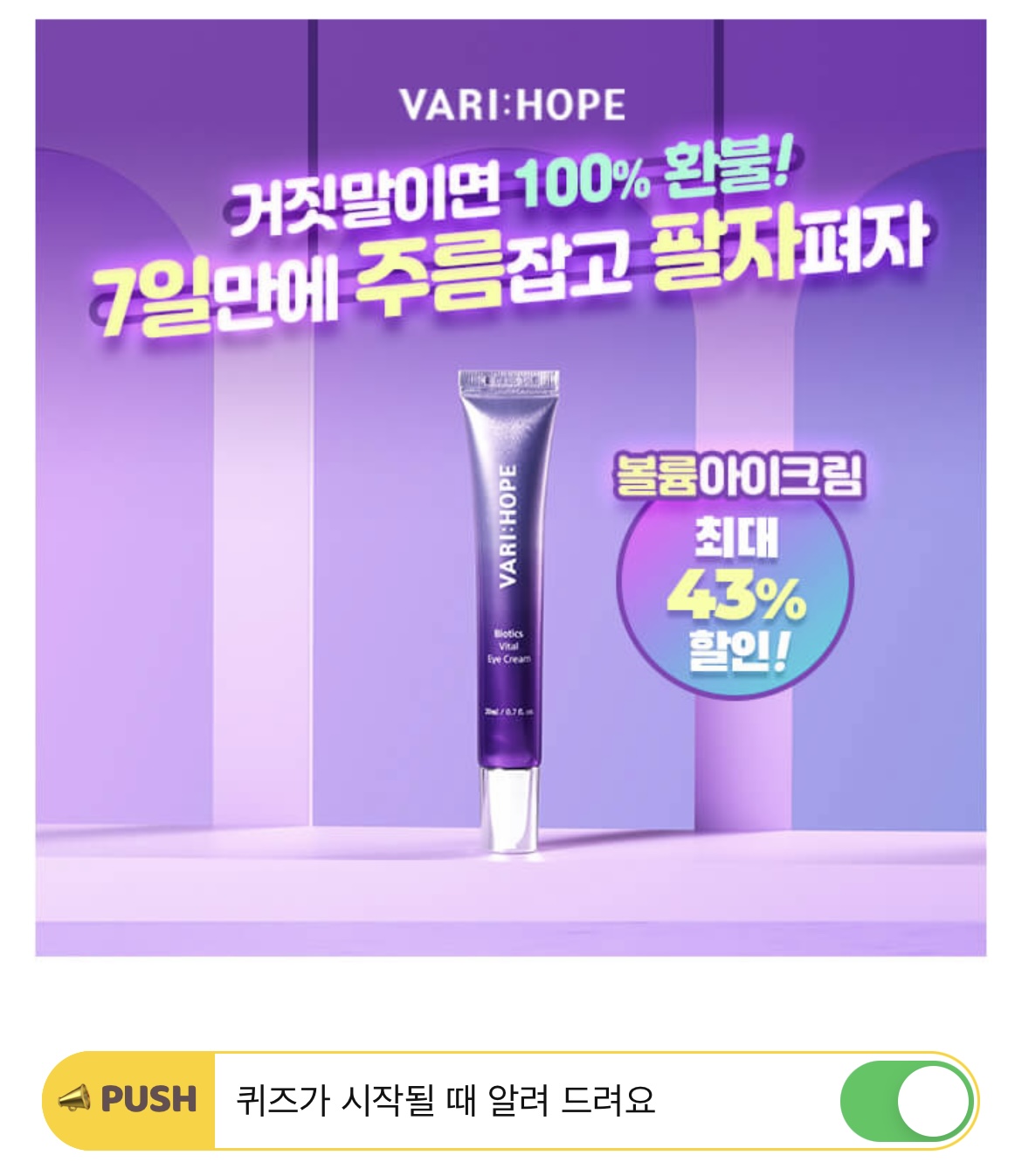 베리홉 볼륨아이크림은 임상 전문기관 엘리드로부터 7일만에 개선되는 눈가OO개선효과를 인증받았습니다. 여기서, OO에 들어갈 단어는 무엇일까요? (힌트 : ㅌㄹ)