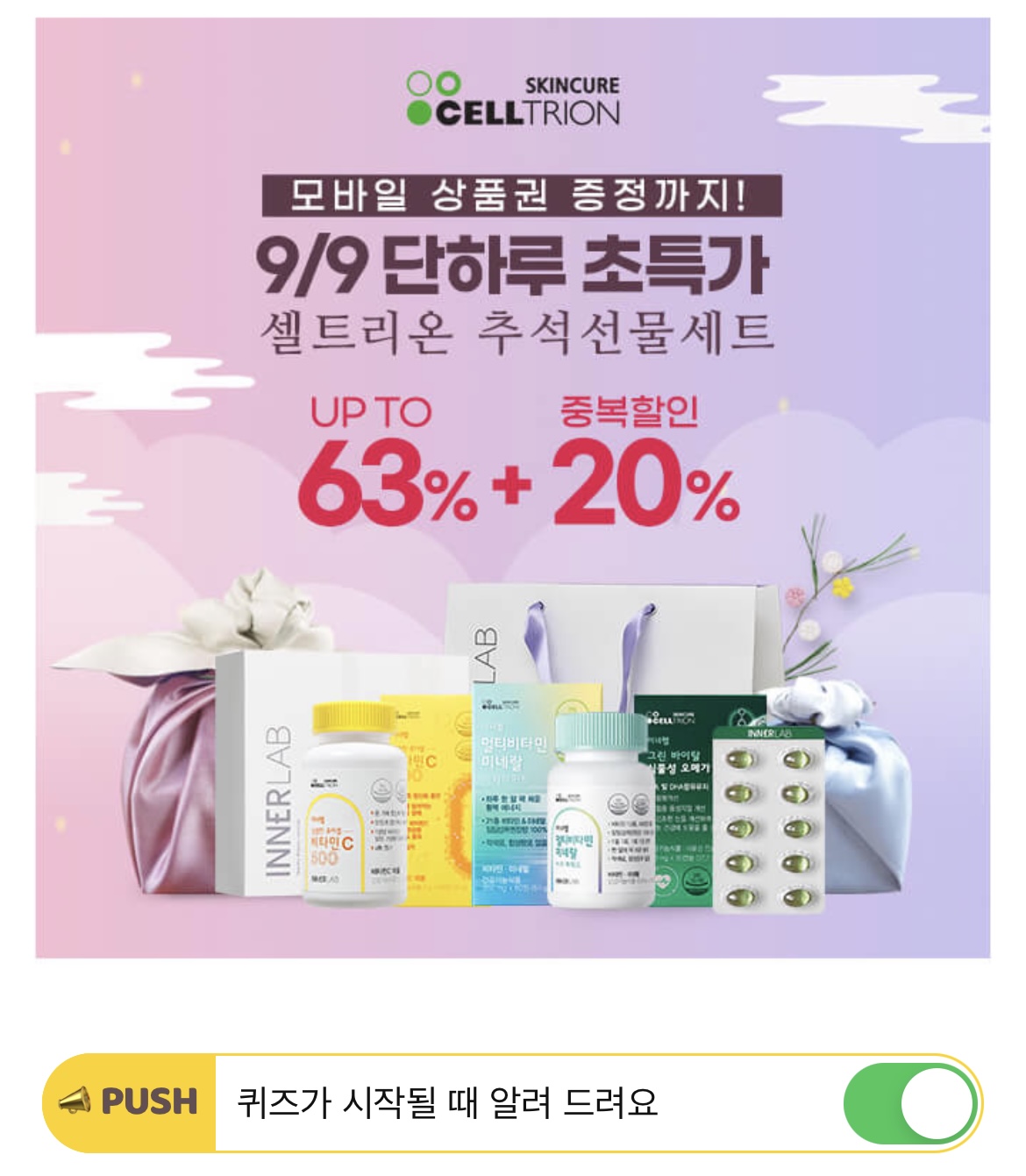 바로지금 명절특집 라이브방송혜택까지 추가! 셀트리온 추석선물제안전에서는, 비타민13종+미네랄8종 함유로 오직 한알 섭취만으로도 활력충전 충분한 OOOOO 4개월분 선물세트를 N사 최저가 보다 저렴하게 구매 가능합니다. 빈칸에 들어갈 단어는 무엇일까요?