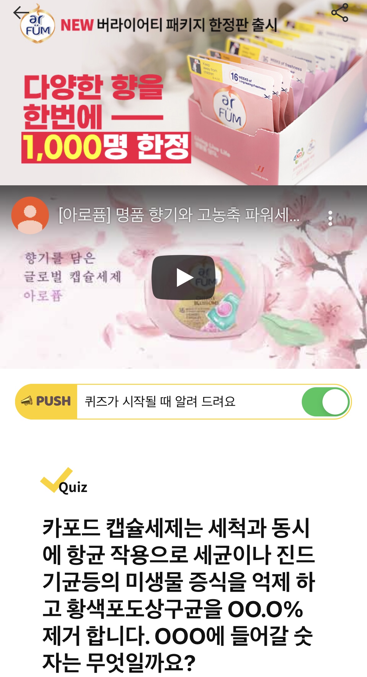 은은하고 풍성한 향기 아로퓸 캡슐세제는 OOO입니다. OOO에 들어갈 단어는 무엇일까요? (힌트 : ㄹㅂㄷ)