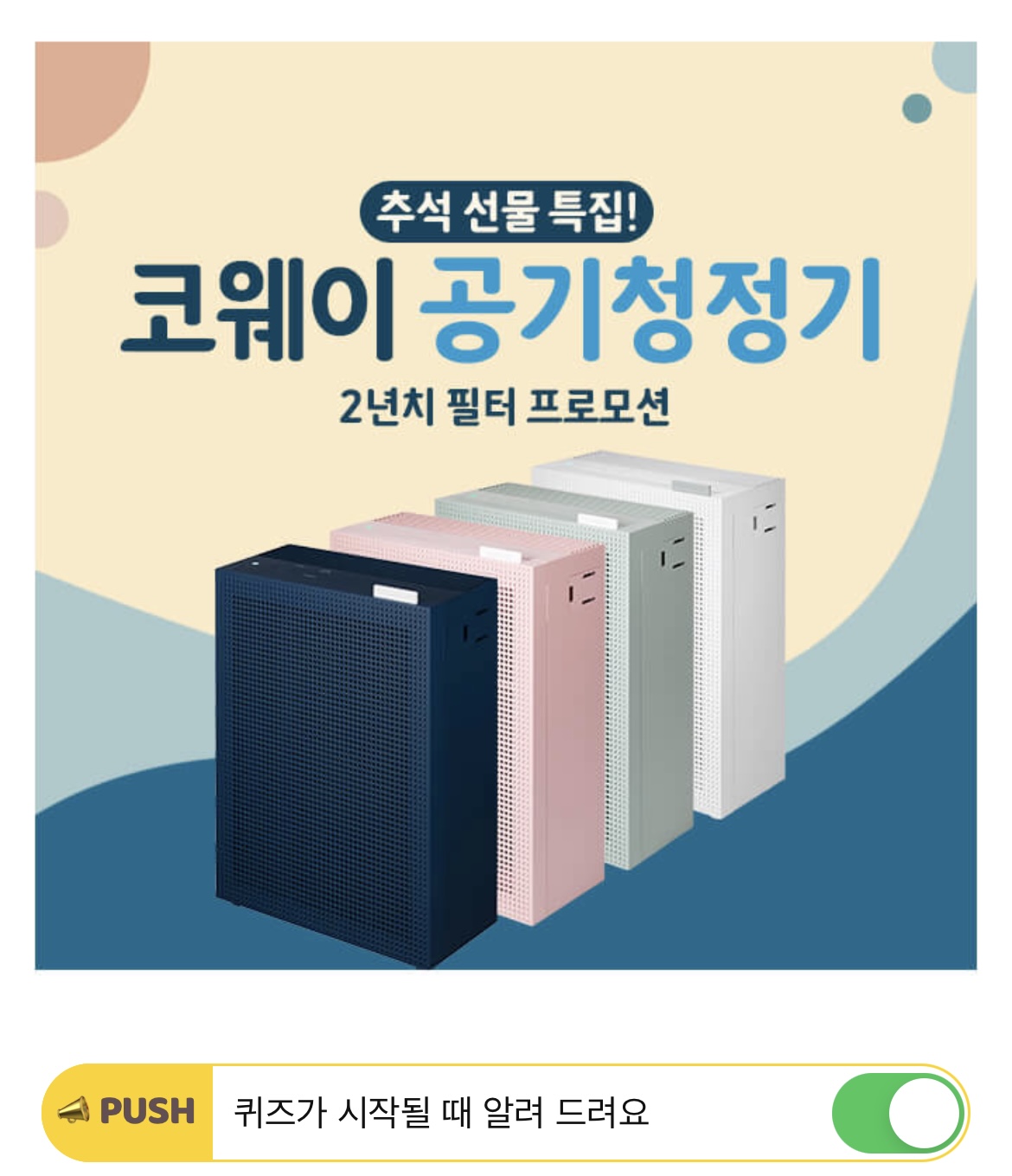 추석선물로 알맞은 코웨이 OOOO공기청정기는 미니멀하고 심플한 디자인에 핵심적인 기능을 담은 자가관리형 공기청정기로, 2년치 필터 추가 증정 프로모션 중이다.