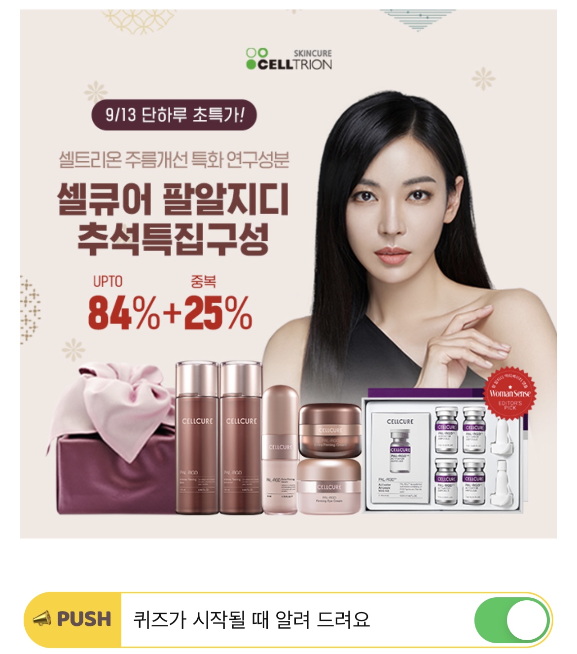 추석특집 라이브방송혜택까지 추가! 셀큐어 팔알지디 엑스트라 퍼밍크림은, 인체 적용 시험 결과! 이미 생긴 굵은 입가 OOO주름 완화와 깊어진 팔자주름 완화에 도움을 주는 것으로 효능 효과를 확인했습니다. OOO에 들어갈 단어는 무엇일까요? (초성 힌트 : ㅂㄷㅅ)