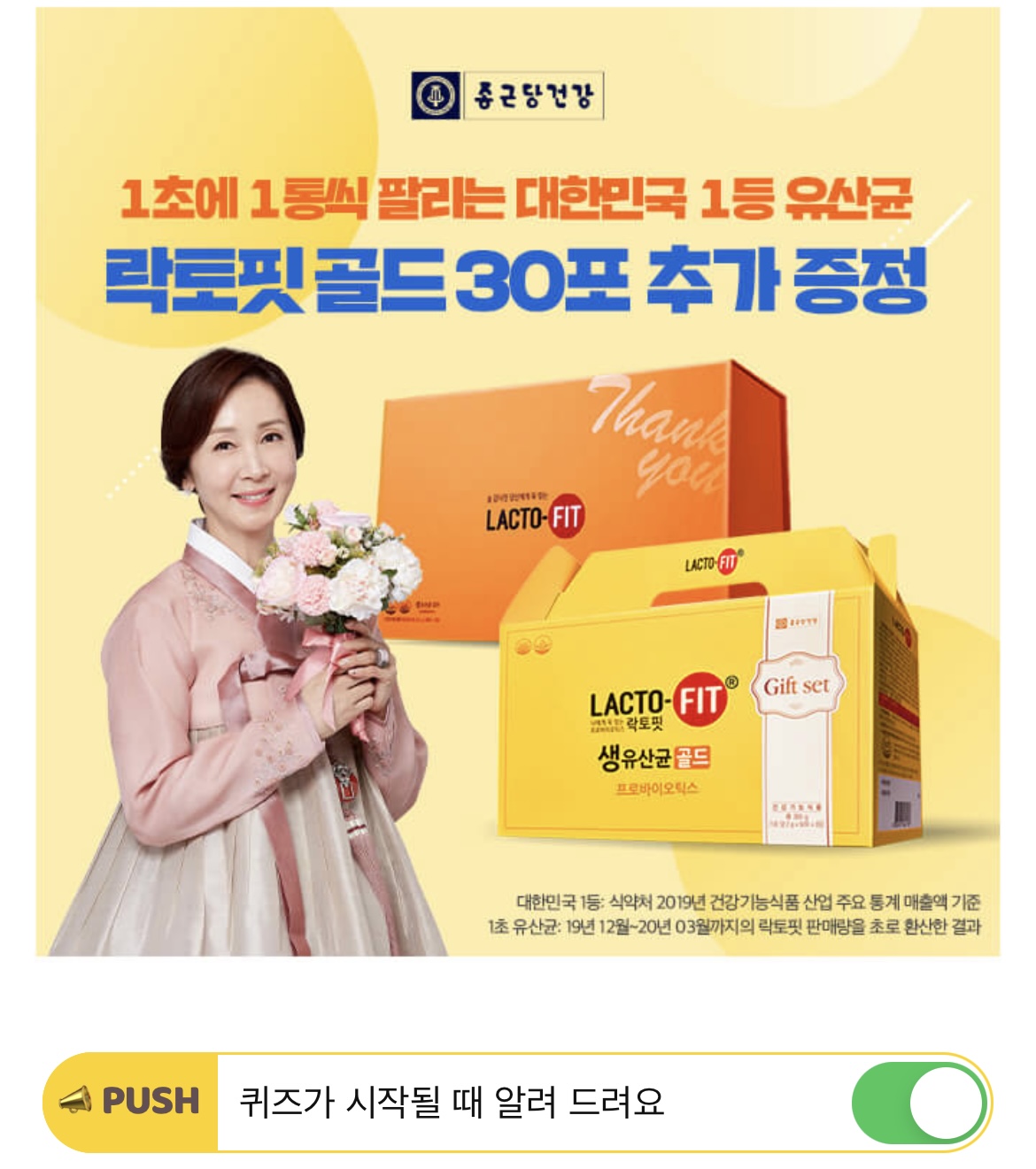 추석 하면 생각나는 브랜드! 종근당 락토핏의 OOOO가 새롭게 돌아왔습니다! 오늘 최대 19,900원 할인 혜택까지 준비되어 있는데요, OOOO에 들어갈 말은 무엇일까요?