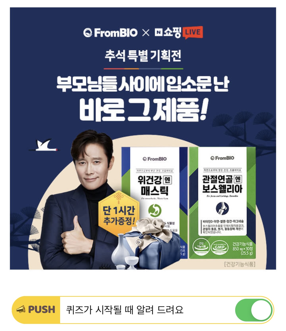 추석을 맞아 부모님들 사이에서 핫한 관절연골엔 보스웰리아, 위건강엔 매스틱, 눈건강에 빌베리플러스 외 베스트제품 구매 시 OOOOO으로 유명한 제품 1개월분을 추가 증정한다고 합니다. OOOOO은 무엇일까요?