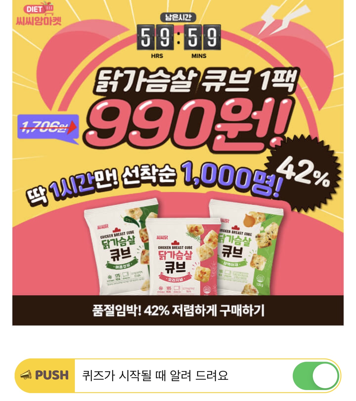 "지금까지 먹어본 닭가슴살 중에서 가장 맛있고, 가격도 착해서 일주일만에 30팩 다 먹고 또 주문하네요." 이 내용은 '씨씨닭' 실제 후기인데요. 지금 진행되는 라이브 방송 중간에 깜짝 이벤트로 선착순 30팩 이상 구매자 80분에게 'OOOOO'를 증정해드립니다!
