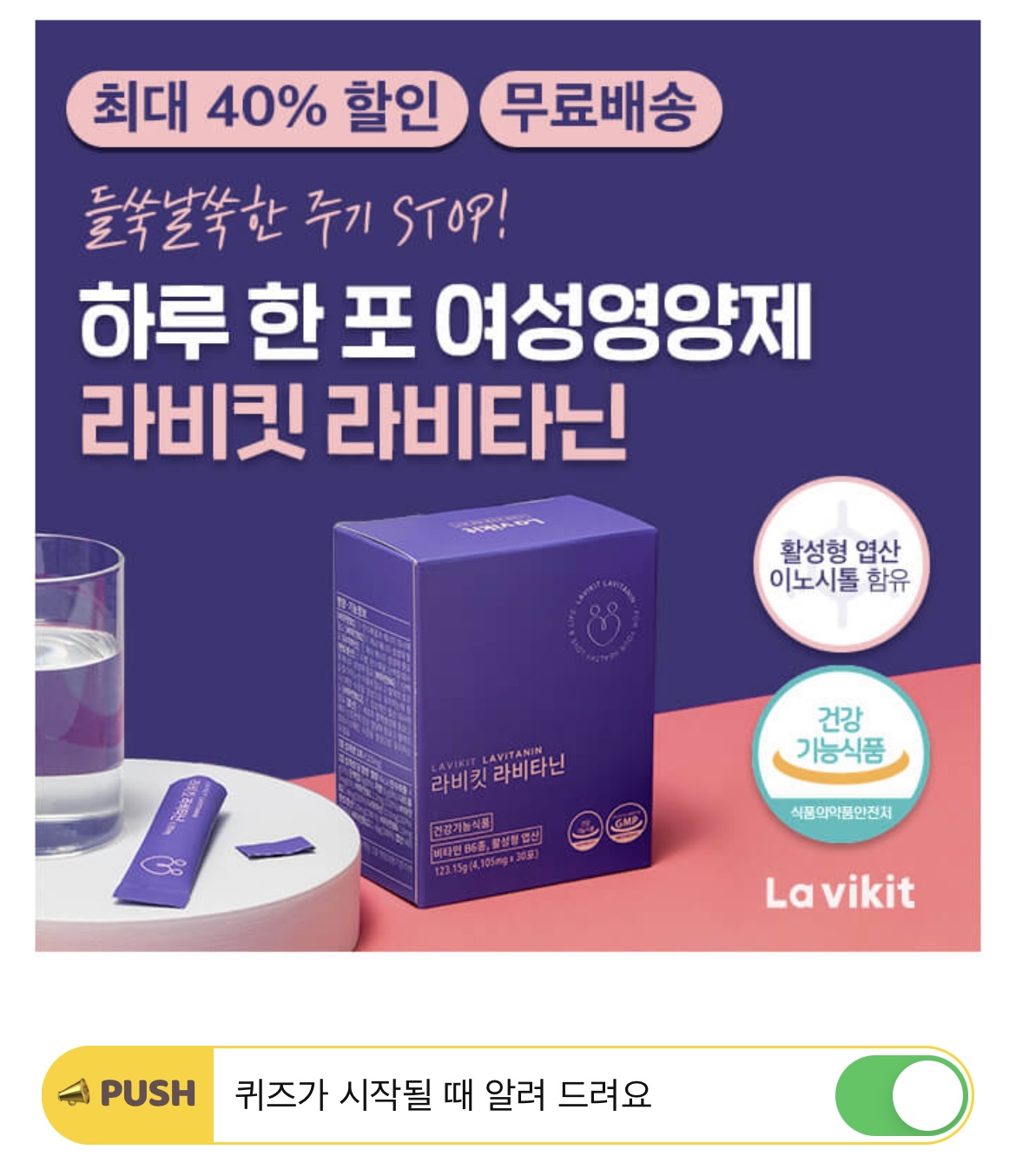 하루 한포 프리미엄 여성 영양제 라비킷 라비타닌은 OOO에서 정식 기능성을 인증받은 건강기능식품입니다.