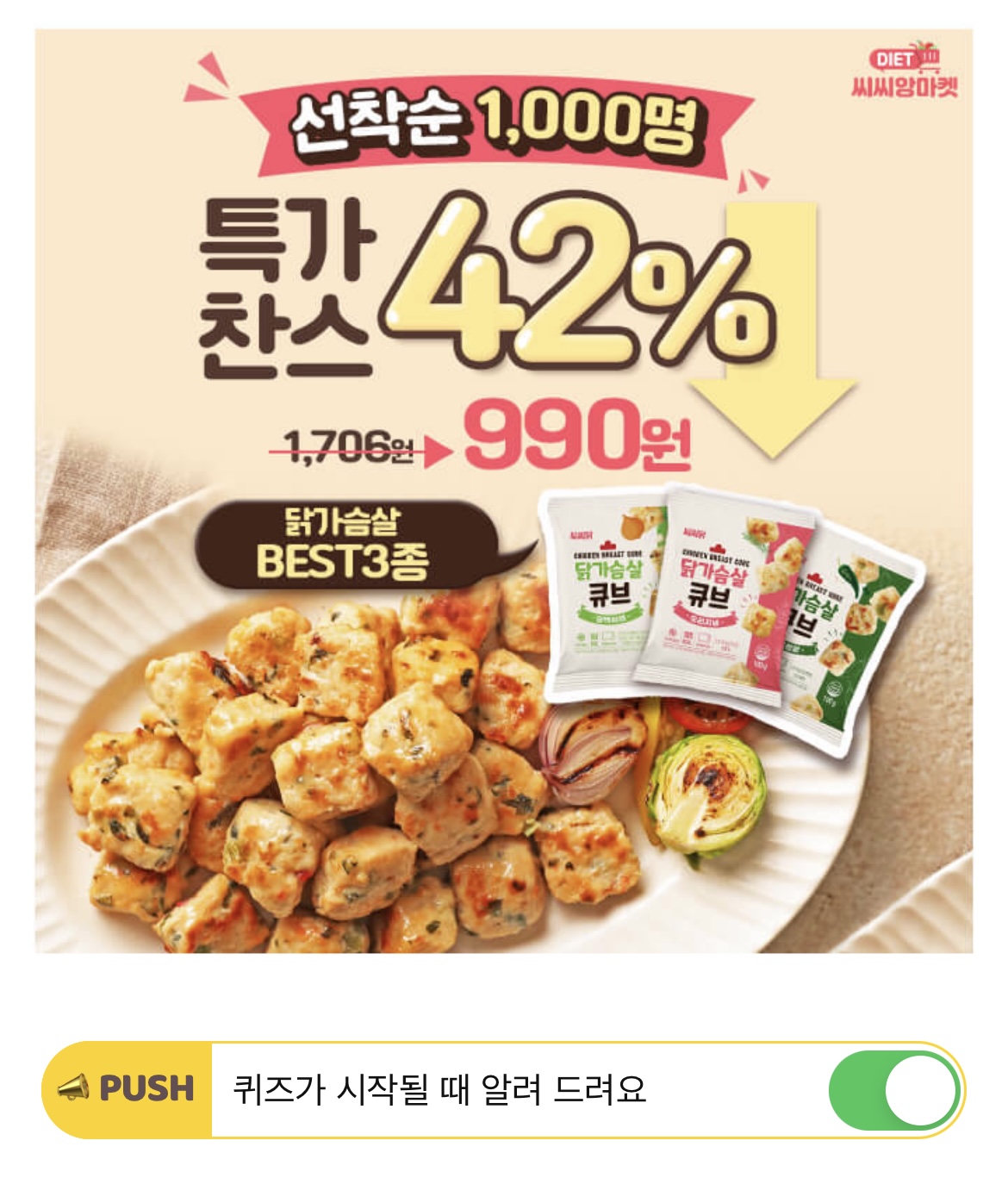 "다이어트 식단 겸 건강식으로 사서 맛있게 잘 먹고 있어요. 담백야채 맛으로 9가지 야채를 다양하게 먹을 수 있어서 아주 좋아요." 이 후기는 9가지 야채를 'OOOO' 넣어 맛과 영양을 모두 챙긴 담백야채 맛 씨씨닭 닭가슴살 큐브 구매자의 실제 후기입니다. 빈칸에 들어갈 단어는 무엇일까요?(힌트: ㅇㄲㅇㅇ)
