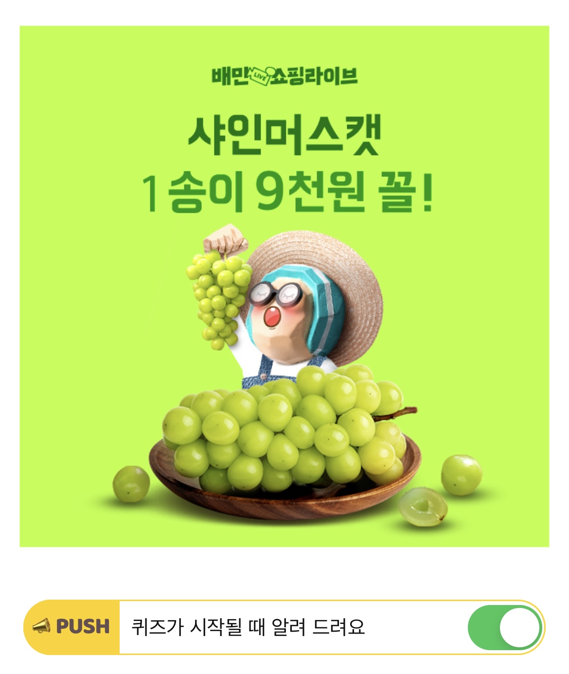 샤인머스캣 1송이가 9천원 대! 오늘 배민쇼핑라이브에서는 샤인머스캣 OO원 추가 쿠폰을 지급하는데요! OO원은 얼마일까요?