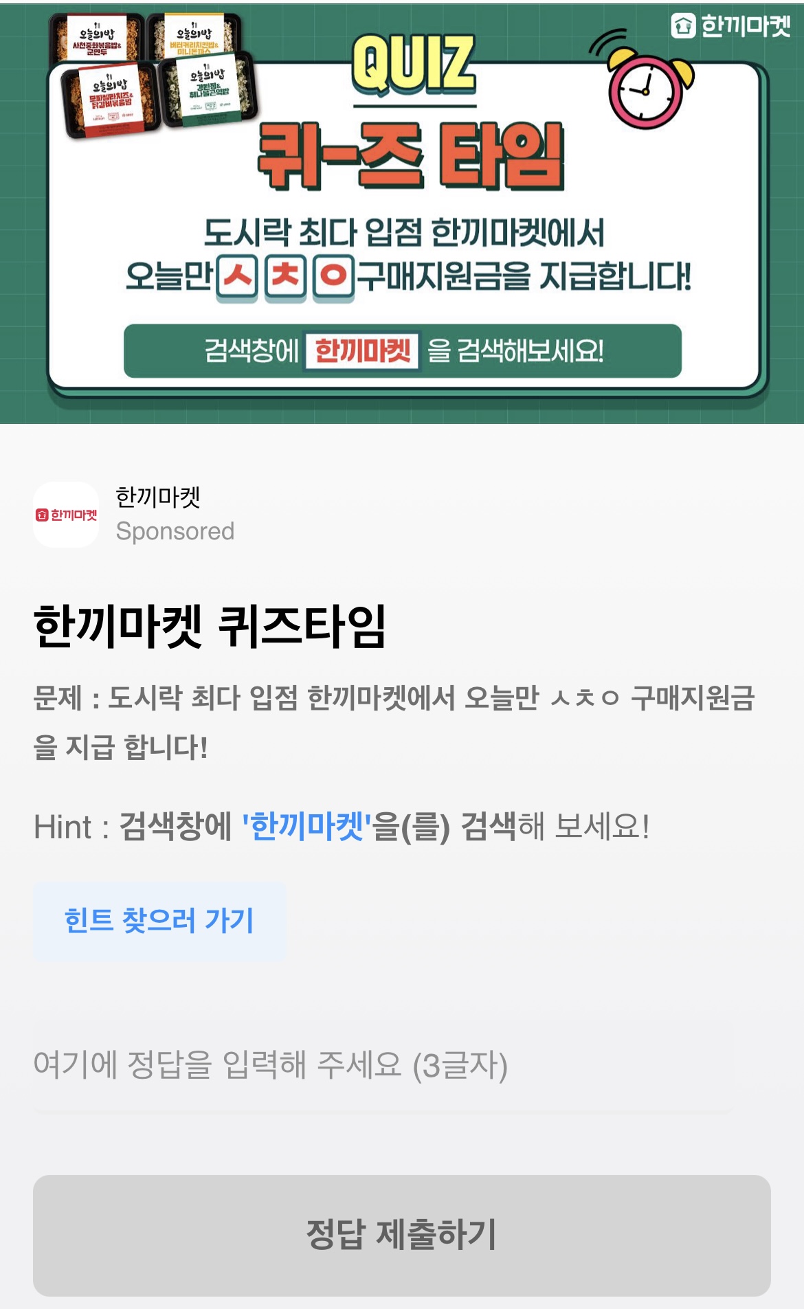 문제 : 도시락 최다 입점 한끼마켓에서 오늘만 ㅅㅊㅇ 구매지원금을 지급 합니다!