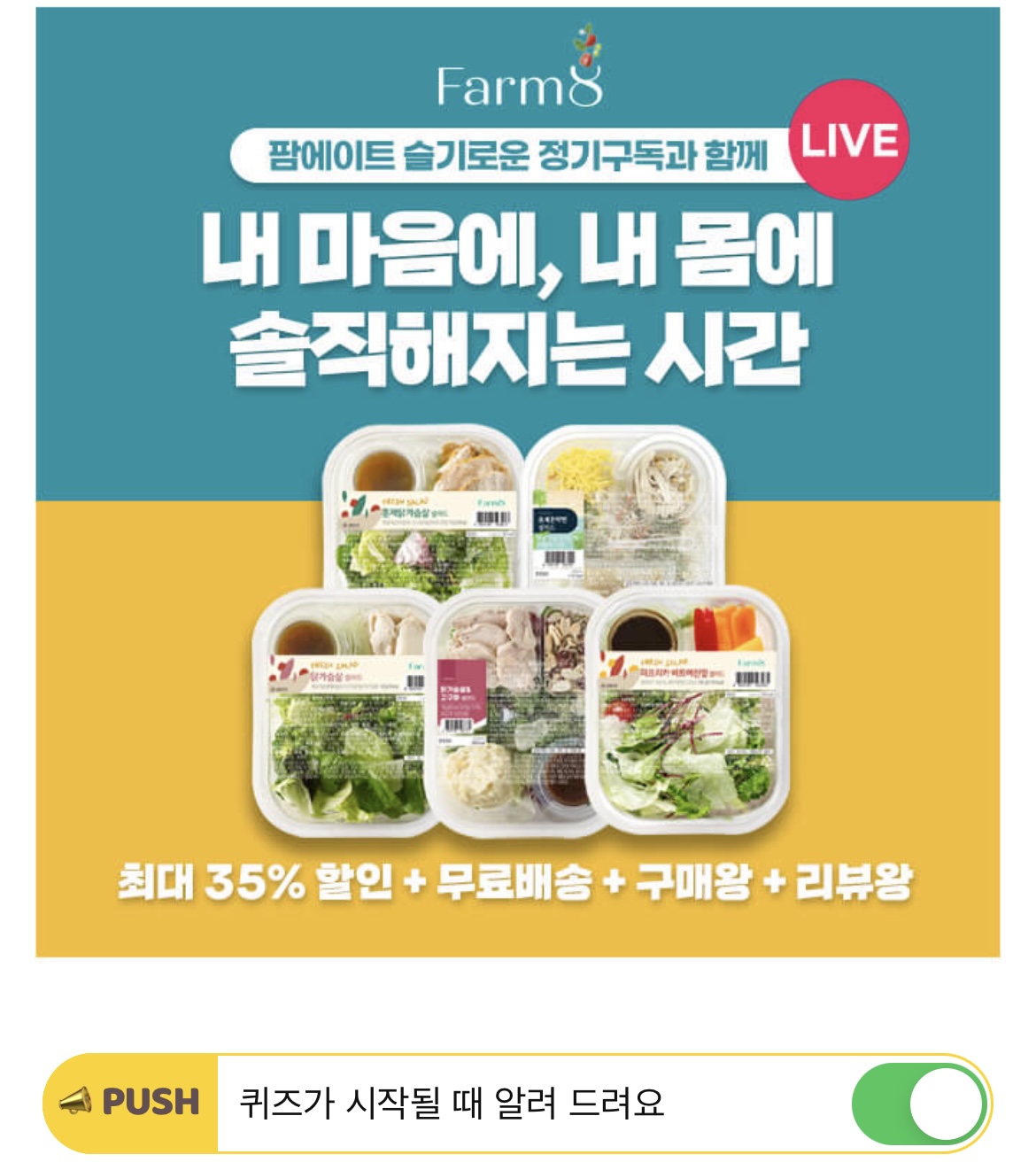 "뭘 좋아할지 몰라서 다 준비해봤어!" 여러분들의 입맛에 맞는 세트 상품을 4주 내내 자유롭게 선택할 수 있어요! 이번주는 쉐프 샐러드를, 다음주는 BEST 샐러드를?! 매주 내 맘대로 골라먹는 OOOO OOOO 신청하기! 오늘 구매하시면 최대 35%할인까지! 빈칸에 들어갈 단어는 무엇일까요? (힌트 : ㅅㄱㄹㅇㅈㄱㄱㄷ)