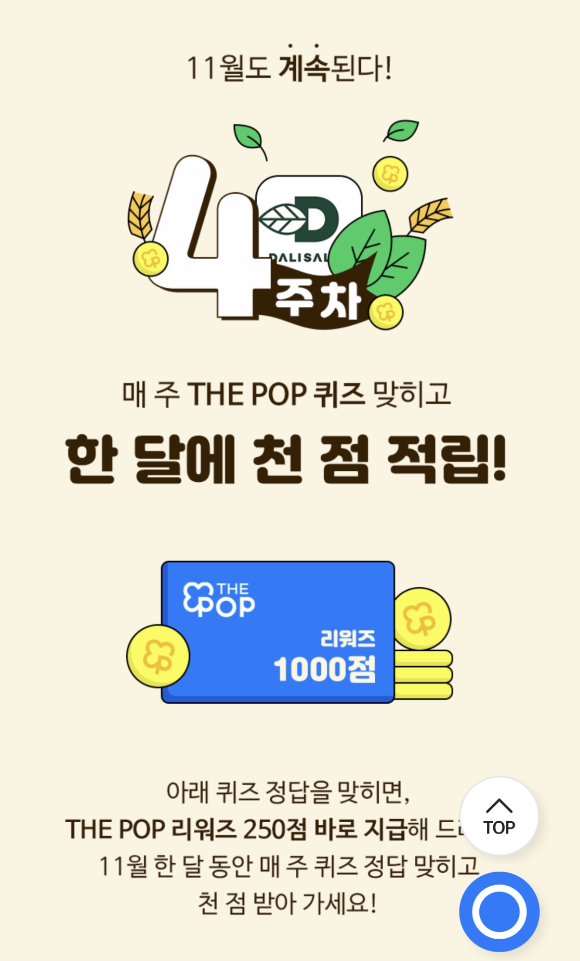 더 팝플러스 퀴즈로 모을 수 있는 포인트는 한 달에 천 점이 적립 가능합니다.