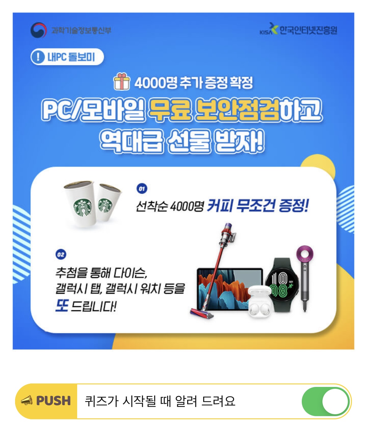 내PC 돌보미 무료점검 이벤트에 참여한 선착순 OOOO명에게는 모두 커피 기프티콘이 제공되며, 그 중 추첨을 통해 다이슨 청소기/헤어드라이기, 갤럭시 워치, 갤럭시탭 등 푸짐한 상품을 드립니다. OOOO에 들어갈 숫자는 무엇일까요?