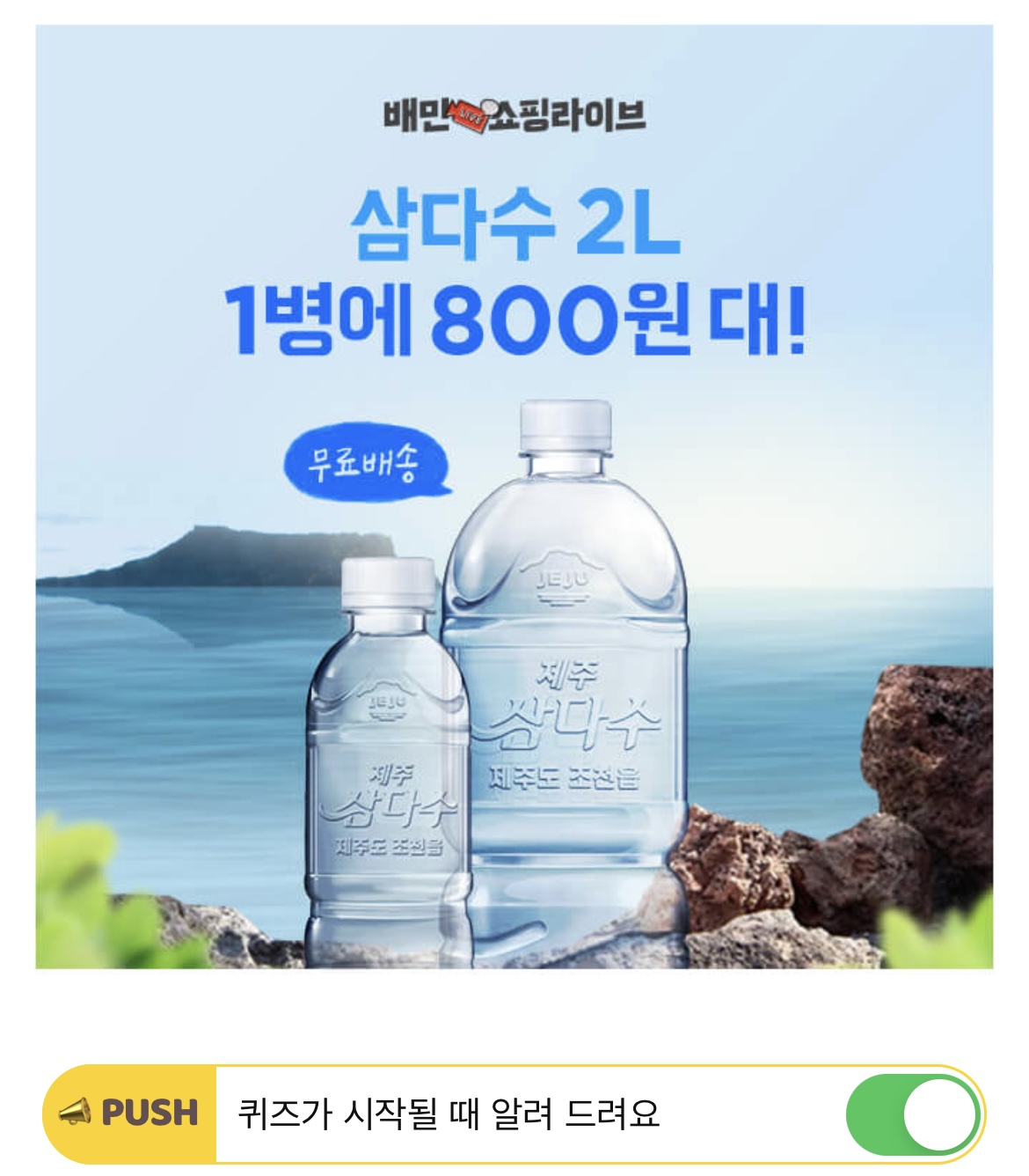 믿고 마시는 삼다수! 오늘 배민쇼핑라이브에서는 삼다수를 최대 OO% 할인하여 초특가로 판매합니다. 00에 들어갈 숫자는 무엇일까요?